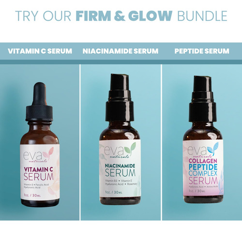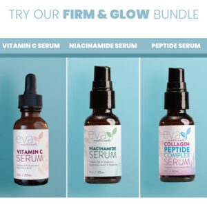 aumentar ainda mais os efeitos iluminadores da niacinamida, incluímos o soro de vitamina C da Eva Naturals em nossa fórmula. Este poderoso antioxidante aumenta a produção de colágeno para uma pele mais firme e com aparência mais jovem, ao mesmo tempo em que reduz a aparência de linhas finas e rugas.