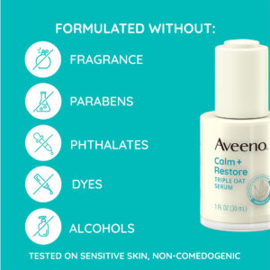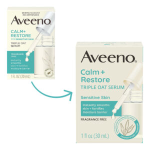 Aveeno Calm + Restore Triple Oat Hydrating Face Serum for Sensitive Skin, Gentle, Lightweight Facial Serum Instantly Smooths Skin, Fast-Absorbing, Hypoallergenic & Fragrance-Free, 1 fl. oz – 1-fluid ounce of Aveeno Calm + Restore Triple Oat Hydrating Face Serum with calming feverfew for sensitive skin to instantly smooth & fortify skins moisture barrier to leave skin feeling soft & supple – Aveeno Calm + Restore designed for sensitive skin with nourishing oat goes beyond soothing & restores skins natural moisture barrier. Serum leaves skin feeling hydrated after just one use. Plus, 92% agreed that skin felt instantly smooth – The gentle, fast-absorbing formula, with Triple Oat Complex & calming feverfew, effectively calms irritated, dry skin while strengthening skins moisture barrier for healthy, more resilience skin & leaves skin feeling soft & supple – Ideal for sensitive skincare, the hypoallergenic & non-comedogenic oat serum is tested on sensitive skin & free of fragrances, parabens, phthalates, dyes & alcohols – From a dermatologist-recommended brand for over 70 years, Aveeno Calm + Restore Oat Facial Serum is clinically proven gentle on eczema prone skin. To use, apply 3 to 4 drops onto hand & massage gently on face