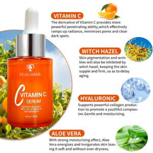 sérum facial – Sérum de vitamina C para rosto: mistura de vitamina C com ácido hialurônico, ácido ferúlico, vitamina E, retinol. Para combater o envelhecimento, melhorar as rugas e manchas escuras. – Sérum facial antioxidante: o soro de vitamina C melhora a formação de colágeno, repleto de antioxidantes para clarear visivelmente a pele, o sérum de vitamina C é leve e fácil de absorver. A pele fica refrescante e não oleosa – Planta formulação à base: ingredientes botânicos de aloe vera, hamamélis e óleo de jojoba são adicionados para hidratar ainda mais a pele e contrair os poros, refinando o estado da pele. – Como usar: Após a limpeza, use após o tônico, tome 3-4 gotas, massageie suavemente com o dedo médio e o dedo anular, do centro do rosto para os lados de dentro para fora, de baixo para cima, massageie suavemente até ser absorvida. A base pode ser usada ao mesmo tempo, fácil de fazer – Garantia pós-venda: os produtos são adequados para pele seca, oleosa, mista e sensível. Nós o reembolsaremos se você achar que é inadequado para sua pele.