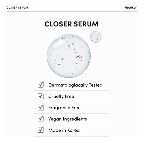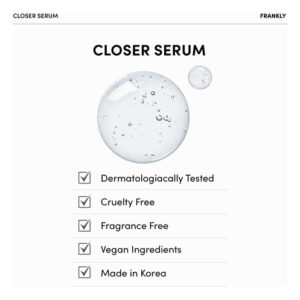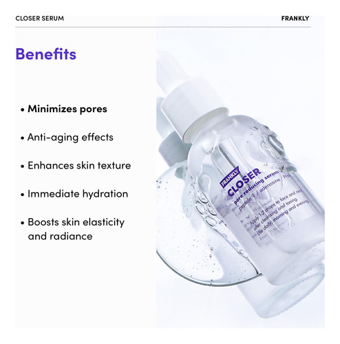 Conheça o best-seller de Frankly! Contendo 9 peptídeos, colágeno vegano, adenosina e PHA, este sérum ajuda a minimizar a aparência de poros e filamentos sebáceos e melhora a elasticidade da pele enquanto fornece hidratação. Os resultados foram comprovados por pesquisas científicas. 19,77% de redução de poros após apenas um uso e 26,75% de redução em duas semanas! Vegano, verde EWG e dermatologicamente testado — BRILHO INSTANTÂNEO E PELE SALTITANTE: A sinergia de nove peptídeos, adenosina e colágeno vegano cria uma tez elástica e brilhante, revitalizando o brilho saudável da pele. – Minimiza os poros e é suave e antienvelhecimento: a adenosina e o colágeno ajudam a reduzir os sinais de envelhecimento, acalmar, reparar a pele e fortalecer a barreira cutânea. O PHA atua como um esfoliante suave que promove a textura perfeita da pele. – TEXTURA DE PELE MAIS SUAVE: Beneficie-se de uma fórmula peptídica que refina e suaviza sua pele. ADICIONE AO CARRINHO AGORA – VEGANO E LIVRE DE CRUELDADE – O Closer Serum é vegano, nunca testado em animais e livre de parabenos, OGM e corantes artificiais. – A CIÊNCIA ENCONTRA A K-BEAUTY – Desenvolvido habilmente pelos cientistas coreanos de cuidados com a pele, cada produto da Frankly representa nosso compromisso com a transparência e a eficácia. Usamos apenas ingredientes cientificamente comprovados e divulgamos abertamente cada conteúdo. Abrace nossa dedicação ao brilho da sua pele e descubra a diferença da Frankly.