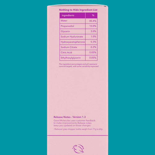 Hyaluronic Acid Serum by Good Molecules 30ml/1oz Replenish your skins moisture content with Hyaluronic Acid Serum from Good Molecules. Formulated with hyaluronic acid, this water-light serum is designed to draw moisture to the skin for long-lasting hydration. With just one use, skin appears smooth, supple, and well-hydrated. See A Difference In Your Skin Formulated with two forms of hyaluronic acid with different molecular weights, our Hyaluronic Acid Serum can penetrate multiple layers of the skin for deep hydration. Hyaluronic acid is a moisturizing ingredient that occurs naturally in the skin. It replenishes the top layers of the skin, encouraging it to look smoother and plumper. By binding to moisture and drawing it into the skin hyaluronic acid can help to maintain a healthy moisture balance and protect from dehydration. Notice firmer more youthful-looking skin with this powerful serum! Easy Addition To Your Beauty Regimen The lightweight, water-based formula layers seamlessly with other skincare and makeup, making it ideal for daily use. Its especially useful as a base serum that helps the skin absorb other products. We recommend using it twice a day, once in the morning and once at night. This formula has a pH of 5.8. It is vegan, gluten-free, fragrance-free, and was never tested on animals. – DEEP, LONG LASTING HYDRATION: Experience the moisturizing power of Hyaluronic Acid! Embrace newfound confidence with the Good Molecules Hyaluronic Acid Serum made with powerful ingredients to help your skin maintain its radiant glow! – PLUMP, FIRM, AND MOISTURIZE: Notice the difference in your skin! This serum works to restore moisture, bringing out the best in your skin. The lightweight serum helps your skin to appear supple, smooth, and firm. – POTENT FORMULA FOR RADIANT SKIN: Our serum contains two forms of hyaluronic acid with different molecular weights, allowing it to penetrate multiple layers of the skin and combat dehydration, and loss of firmness. – PERFECT ADDITION TO YOUR BEAUTY REGIMEN: Apply a few drops in the morning and at night before oils, creams, and moisturizers. For best results, apply to damp skin. Let absorb for 30 seconds before continuing with your routine. – GENTLE ENOUGH FOR ALL SKIN TYPES: Powerful enough to bring results and gentle enough for daily use; this serum is suitable for all skin types. Our serum has a pH of 5.8 and is vegan, gluten-free, fragrance-free, and cruelty-free.