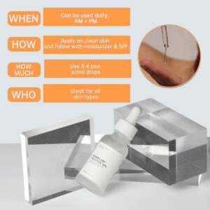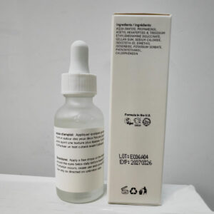 Argireline é capaz de formar uma película na superfície da pele, proporcionando um efeito hidratante. Também promove o crescimento e a síntese de colágeno, melhorando a elasticidade e firmeza da pele. 1. Promover a síntese de colágeno Argireline pode promover o crescimento e a síntese de colágeno, aumentar a densidade e a quantidade de colágeno, melhorando assim a elasticidade e firmeza da pele, tornando a pele mais elástica e firme. 2. Melhore a retenção de umidade da pele Argireline pode formar uma película na superfície da pele, que pode reduzir a evaporação da água, agindo assim como um agente hidratante e tornando a pele mais hidratada.3. Antioxidante A argirelina tem um efeito antioxidante, que pode neutralizar os radicais livres, prevenindo o envelhecimento da pele e melhorando a qualidade da pele. – 10% de soro de argirelina: com concentração de 10%, nosso sérum é eficaz na redução de rugas, equilibra os óleos faciais, repara a pele seca e fornece proteção duradoura – Sérum antienvelhecimento: experimente os potentes benefícios antienvelhecimento de nosso sérum de argirelina, que é enriquecido com produtos orgânicos antienvelhecimento suficiente para reduzir eficazmente as rugas, linhas finas e reparar danos, mantendo assim a aparência jovem da pele – Hidratação e rejuvenescimento definitivos: nosso sérum argireline oferece uma aplicação perfeitamente suave, sem viscosidade ou odores. Com ácido hialurônico para hidratar a longo prazo e hidratar profundamente a pele para ajudar a pele a ficar mais lisa e elástica – Adequado para todas as peles: nosso sérum de argirelina é um sérum à base de água adequado para todos os tipos de pele. Se você tem pele desidratada ou seca, pele opaca ou oleosa, isso deixará sua pele brilhante e revitalizada. Uso diário: incorpore nosso sérum de argirelina em sua rotina diária. Use de manhã e à noite, sozinho ou em combinação com loção ou creme facial. Aplique 3-4 gotas e massageie suavemente no rosto e pescoço para fortalecer as defesas naturais da pele