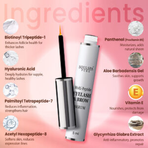 Experimente o poder transformador de, meticulosamente formulado para aprimorar e revitalizar seus cílios e sobrancelhas. Este sérum de cílios avançado para aumentar os cílios apresenta uma fórmula de dupla ação que serve tanto como sérum para sobrancelhas quanto para cílios, projetado para promover cílios e sobrancelhas visivelmente mais espessos e saudáveis. Em sua essência, uma mistura potente de biotina e peptídeos funciona sinergicamente para apoiar o crescimento natural, garantindo que cada fio seja nutrido da raiz às pontas. Enriquecido com ácido hialurônico, nosso sérum para crescimento de cílios funciona como um condicionador intensivo para cílios, proporcionando hidratação profunda e nutrição essencial aos delicados folículos capilares. Esse ingrediente chave ajuda a combater o ressecamento e o adelgaçamento, revitalizando seus cílios e sobrancelhas para uma aparência mais completa. O complexo peptídeo avançado do sérum, incluindo tripeptídeo-1 de biotinoil, tripeptídeo-1 de palmitoílo-1 e acetil hexapeptídeo-8, foi projetado para melhorar a saúde geral e a aparência de seus cílios e sobrancelhas, tornando-o uma parte indispensável de seu regime diário de beleza. Para aqueles que buscam fortalecer e engrossar seus cílios e sobrancelhas, nosso condicionador de cílios e sérum de crescimento funcionam incansavelmente durante a noite para fortalecer e melhorar. A aplicação regular é simples com o aplicador de precisão incluído, que garante que cada tratamento seja eficaz e eficiente, visando a linha dos cílios e as áreas das sobrancelhas com precisão. Embalado em um prático frasco de 5 mL, o SOULSPA PURE Eyelash Serum é fácil de aplicar e projetado para uso diário. Esteja você em casa ou em trânsito, incorpore esse sérum poderoso à sua rotina para aproveitar todos os benefícios e entrar em cada dia com confiança, ostentando cílios e sobrancelhas exuberantes e lindos. – E: O Lash Serum oferece benefícios como sérum para sobrancelhas e cílios, formulado para promover cílios e sobrancelhas mais saudáveis e espessos. Combinando biotina e peptídeos, este sérum nutre a saúde natural dos cílios e sobrancelhas -: Infundido com ácido hialurônico, nosso sérum para cílios serve como um poderoso condicionador de cílios, proporcionando hidratação e nutrição profundas aos delicados folículos capilares. É uma solução ideal para revitalizar cílios e sobrancelhas secos e finos -: Com uma mistura de tripeptídeo de biotinoil 1, palmitoil tripeptídeo-1 e acetil hexapeptídeo 8, este melhor sérum de cílios para o crescimento de cílios melhora efetivamente a aparência de seus cílios e sobrancelhas, estabelecendo-se como uma parte essencial das rotinas diárias de beleza -: Uso regular deste sérum um transforma a aparência de seus cílios e sobrancelhas. Nosso condicionador de cílios e sérum de crescimento funcionam durante a noite para fortalecer e engrossar, melhorando os resultados de cada aplicação de crescimento de cílios e sobrancelhas -: Este sérum de crescimento de cílios e sobrancelhas é embalado em um frasco de 5 mL com um aplicador de precisão para uso fácil. Aplique diariamente na pele limpa e seca ao longo da linha dos cílios e sobrancelhas para se beneficiar totalmente do sérum para cílios e sobrancelhas, realçando seus cílios e sobrancelhas de forma eficaz