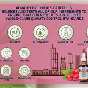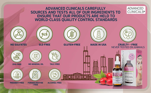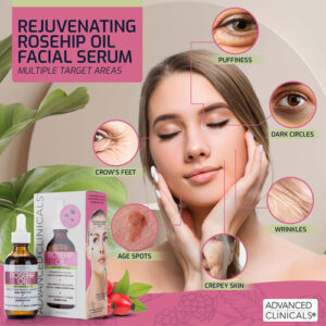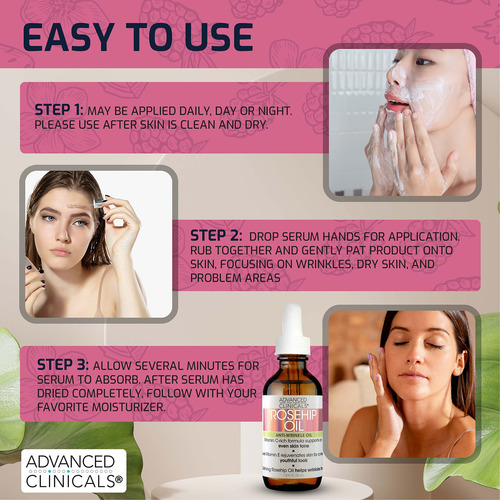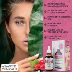 Este poderoso óleo facial antienvelhecimento ajudará instantaneamente a reduzir a aparência de rugas, hiperpigmentação, olheiras, manchas solares, manchas da idade, cicatrizes, estrias e linhas finas. O óleo puro de rosa mosqueta, contendo vitamina C essencial, combate os danos causados pelo sol e as manchas solares. O óleo facial de rosa mosqueta funciona como um hidratante facial intensivo e nutre profundamente a pele para uma pele mais lisa e saudável. Você pode até mesmo aplicá-lo em seus cabelos e unhas para dar brilho e brilho. Pode ser usado em todos os tipos de pele e também no pescoço e no pescoço para obter mais benefícios hidratantes. – O ÓLEO DE ROSA MOSQUETA PURO COMBINADO COM OUTROS ingredientes antienvelhecimento altamente CONCENTRADOS, como vitamina C, vitamina E pura, ajuda a corrigir problemas visíveis da pele, como rugas, vermelhidão, cicatrizes, linhas finas, manchas da idade e pele seca. O óleo de rosa mosqueta prensado a frio ajuda com cabelos secos e danificados e é ótimo para unhas e cutículas quebradiças. – FÓRMULA PURA COM INGREDIENTES NATURAIS – A mistura rica em antioxidantes hidrata e clareia instantaneamente a pele. Livre de parabenos e álcool, esse óleo é uma ótima alternativa aos tratamentos profissionais. O óleo de rosa mosqueta funciona com qualquer tipo de pele e transforma a textura e o tom da pele para uma pele mais macia e brilhante. – RESULTADOS INSTANTÂNEOS – O óleo facial repõe instantaneamente a umidade para uma pele mais lisa e macia. Com o uso diário, você verá maior hidratação, brilho aprimorado e tom de pele mais uniforme. Em apenas 6 semanas, você verá melhorias visíveis em problemas de pele, como cicatrizes, estrias, danos causados pelo sol, linhas finas e rugas. – HIDRATAÇÃO HIDRATANTE E EXTREMA – Restaure a aparência jovem de sua pele com este óleo facial antienvelhecimento de primeira linha da Advanced Clinicals. O óleo de rosa mosqueta acalma e hidrata qualquer tipo de pele (pele seca, pele oleosa e pele sensível) para uma tez mais brilhante e maior elasticidade. – RENOVE E RESTAURE A fórmula não oleosa e suave de PH balanceado, livre de: parabenos, álcoois secantes, PEGs, sulfatos, corantes e talco. Fabricado em nosso laboratório regulamentado e inspecionado pela FDA em Chicago, Brasil. Na Advanced Clinicals, temos o compromisso de ajudar você a se sentir confiante em sua pele e garanti-la com soluções comprovadas. Nutra, suavize e proteja sua pele enquanto reduz a aparência incômoda de linhas finas, flacidez da pele e rugas.
