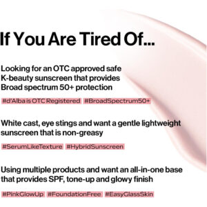 Protetor solar Waterfull Tone-Up 1,69 fl.oz – POR QUE PROTETOR SOLAR WATERFULL TONE-UP? Descubra o protetor solar facial #1 da Coreia, agora mais vendido globalmente, que oferece um brilho úmido e proteção essencial com SPF 50+ com uma textura exclusiva semelhante a um sérum para uma pele radiante e hidratada – Registrado sem registro OTC, os protetores solares podem não atender aos padrões de segurança. D'alba garante proteção de amplo espectro SPF 50+, oficialmente aprovada para uso sem preocupações. – HIDRATAÇÃO DURANTE TODO O DIA E TONIFICAÇÃO NATURAL Uma mistura de essência rica em água e tecnologia de brilho rosa, fornecendo umidade durante todo o dia sem sensação de oleosidade, deixando um brilho natural. – HYBRID BROAD SPECTRUM combina o melhor de filtros UV minerais e químicos para proteção suave e sem irritações contra os raios UVA e UVB. – Adequado para todos os tons de pele. O tom rosa universalmente lisonjeiro aprimora os tons naturais da pele, tornando-o uma base perfeita para maquiagem. – Suave e sem costura. – Suave e sem manchas brancas, sem grumos e sem picadas nos olhos para um acabamento perfeito e sem irritações. – INGREDIENTES PODEROSOS Com extrato de trufa branca e vitamina E, esse protetor solar ajuda proteja sua pele dos estressores ambientais e, ao mesmo tempo, ofereça proteção de amplo espectro.