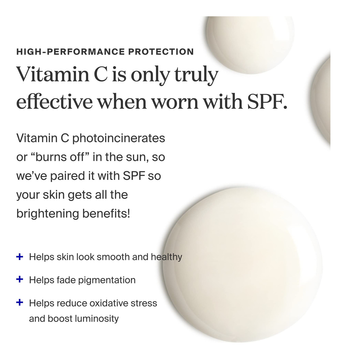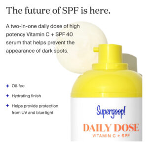 Super goop! Dose diária de vitamina C + SPF 40 PA+++, 1 fl oz – Sérum protetor solar de amplo espectro – Ajuda a clarear visivelmente a pele e a aparência de manchas escuras – Para todos os tipos de pele – ILUMINA A PELE – Você sabia que a vitamina C só é realmente eficaz quando usada com SPF? Dose diária de vitamina C + SPF 40 é o primeiro sérum híbrido a combinar vitamina C estável com protetor solar de amplo espectro para uma pele visivelmente mais brilhante e saudável. – EVITE MANCHAS ESCURAS – Esta fórmula hidratante e sem óleo ajuda a filtrar as duas principais causas das manchas escuras: luz UV e azul. – INGREDIENTES PODEROSOS – A vitamina C e o extrato de ameixa Kakadu ajudam a melhorar o brilho e a luminosidade da pele, a niacinamida ajuda a melhorar o brilho e a luminosidade da pele para uniformizar o tom da pele e reduzir a aparência dos poros, e um extrato marinho ajuda a filtrar a pele da luz azul. – COMO APLICAR – Se este for o único produto SPF em Em sua rotina de cuidados com a pele, aplique generosa e uniformemente à medida que o sérum pisa, 15 minutos antes da exposição ao sol. – DICA PROFISSIONAL – Use o sérum de vitamina C + SPF 40 em dose diária como parte de um guarda-roupa com SPF para atingir seus objetivos de pele. Aplique 2 a 3 bombas como passo do sérum e, em seguida, aplique seu hidratante, primer ou creme CC favorito com SPF para uma pele feliz e saudável.