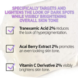 O soro de ácido tranexâmico da lista INKEY – O soro de ácido tranexâmico da lista INKEY. Este tratamento em gel combate a hiperpigmentação, manchas irregulares e manchas escuras enquanto ilumina a tez da pele. – Uniformiza suavemente o tom da pele. Com uma grande quantidade de ingredientes, esse tratamento reduz visivelmente as cicatrizes de acne e atinge a pele opaca. É seguro para todos os tipos de pele. – Ingredientes poderosos, resultados reais. 2% de ácido tranexâmico ajudam a reduzir a hiperpigmentação, o extrato de açaí promove um tom de pele uniforme e a vitamina C dá à pele um impulso de brilho. – Como usá-lo. De manhã e à noite, após limpar e aplicar um sérum hidratante, use uma quantidade do tamanho de uma ervilha de soro de ácido tranexâmico no rosto e pescoço. Espere 30 minutos antes de seguir com um hidratante. – Suas necessidades, nosso conhecimento. Acreditamos que um melhor conhecimento possibilita melhores decisões. Cuidar da pele é uma jornada e estamos nela juntos.