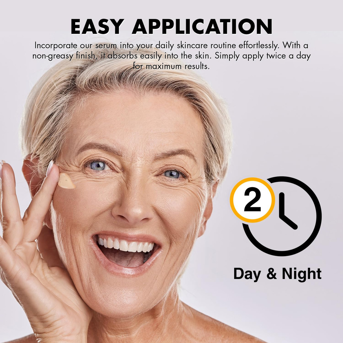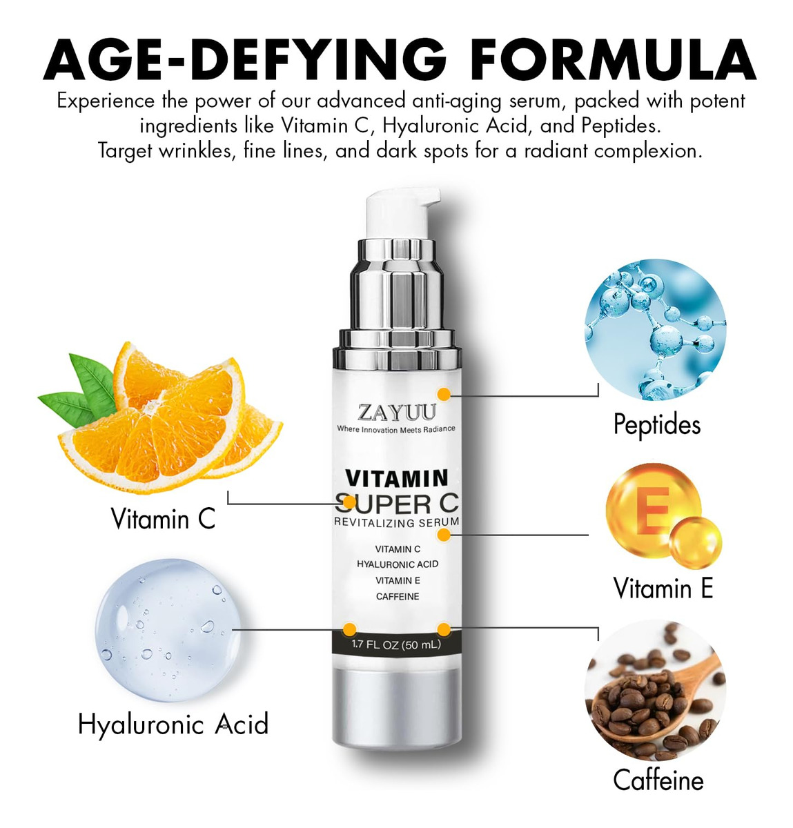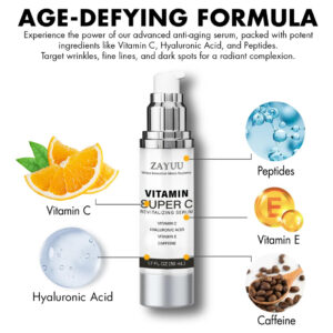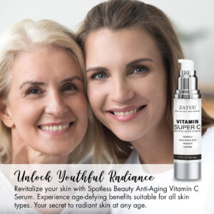 Revitalize sua pele com nosso Sérum Super C, especialmente desenvolvido para mulheres com mais de 70 anos. Esta fórmula de 1,7 fl. oz. (50 mL) combina o poder da vitamina C, ácido hialurônico e peptídeos para combater rugas, manchas escuras e tons de pele irregulares. Experimente os benefícios antienvelhecimento do nosso sérum, adequado para todos os tipos de pele. Desbloqueie uma tez mais brilhante e jovem com Spotless Beauty, seu segredo para uma pele radiante em qualquer idade. – Fórmula antienvelhecimento: fórmula poderosa que desafia a idade, projetada especificamente para mulheres com mais de 50 anos. Repleto de ingredientes potentes, incluindo vitamina C, ácido hialurônico, niacinamida, vitamina E, cafeína e peptídeos, ele combate rugas, linhas finas e manchas escuras, revelando uma tez radiante. – Redução de rugas: experimente o poder de nossa fórmula superhidratante que reduz eficazmente as rugas, deixando sua pele gorda e visivelmente mais jovem. Diga adeus às linhas finas e olá a uma aparência mais suave e jovem. – Correção de manchas escuras: nosso sérum de vitamina C atua como um corretor de manchas escuras, diminuindo as manchas da idade e promovendo um tom de pele uniforme. Obtenha uma tez mais brilhante e luminosa com o uso consistente de nosso sérum rejuvenescedor. – Tom de pele uniforme: formulado com ingredientes potentes, nosso sérum tem como alvo tons de pele irregulares, revelando uma tez mais equilibrada e jovem. Restaure o brilho e a vitalidade naturais de sua pele com nosso sérum rejuvenescedor de pele. – Adequado para todos os tipos de pele: nosso sérum versátil é meticulosamente elaborado para atender a todos os tipos de pele, incluindo pele madura. Enriquecido com vitaminas e nutrientes, ele revitaliza a pele, deixando-a com aparência e sensação revigorada. – Fácil de usar: incorpore nosso sérum à sua rotina diária de cuidados com a pele para uma absorção fácil e um acabamento não oleoso. Basta aplicar duas vezes ao dia, de manhã e à noite, para obter o máximo de resultados.