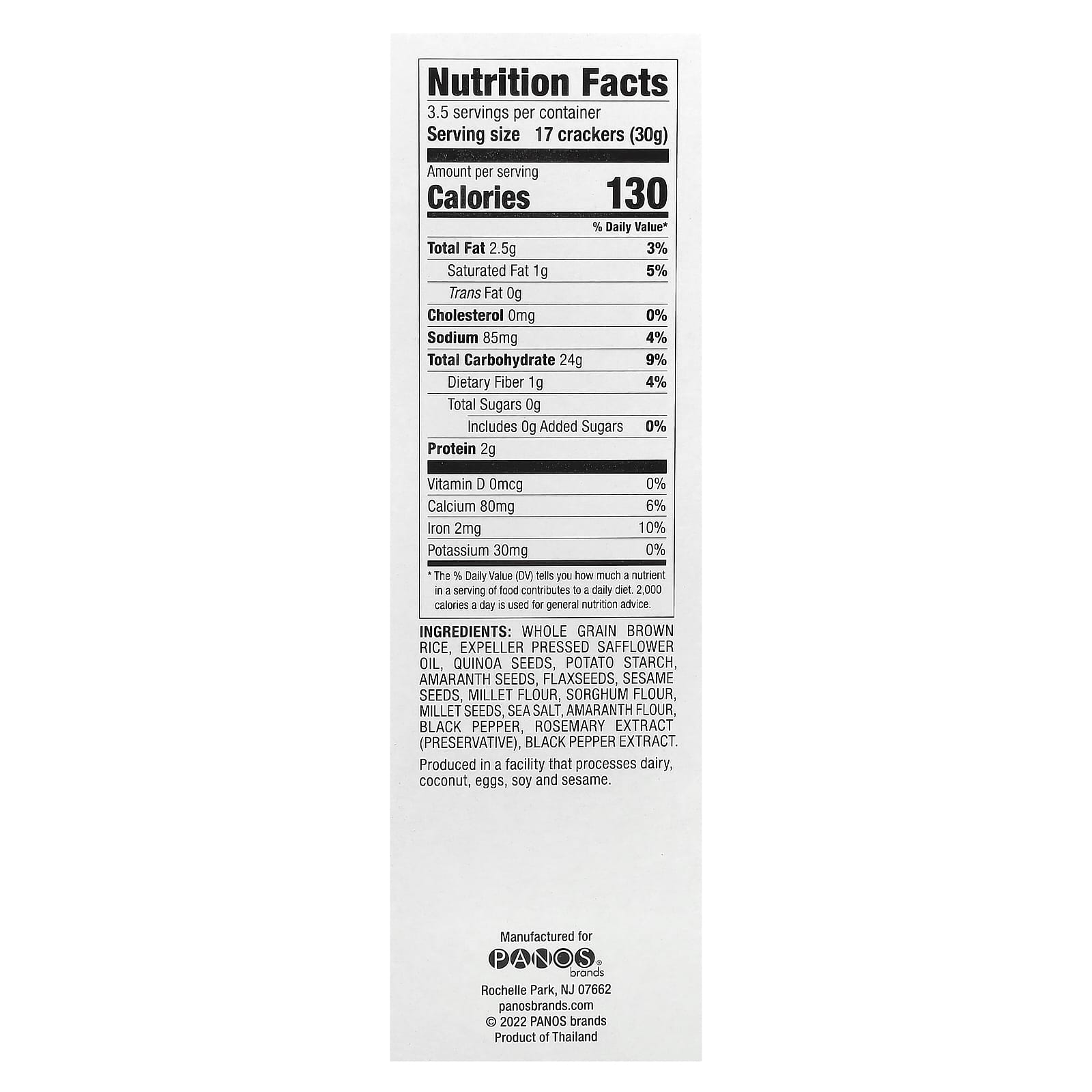 Arroz integral, óleo de cártamo extraído em prensa, sementes de quinoa, amido de batata, sementes de amaranto, linhaça, sementes de gergelim, farinha de milhete, farinha de sorgo, sementes de milhete, sal marinho, farinha de amaranto, pimenta-do-reino, extrato de alecrim (conservante), extrato de pimenta-do-reino.