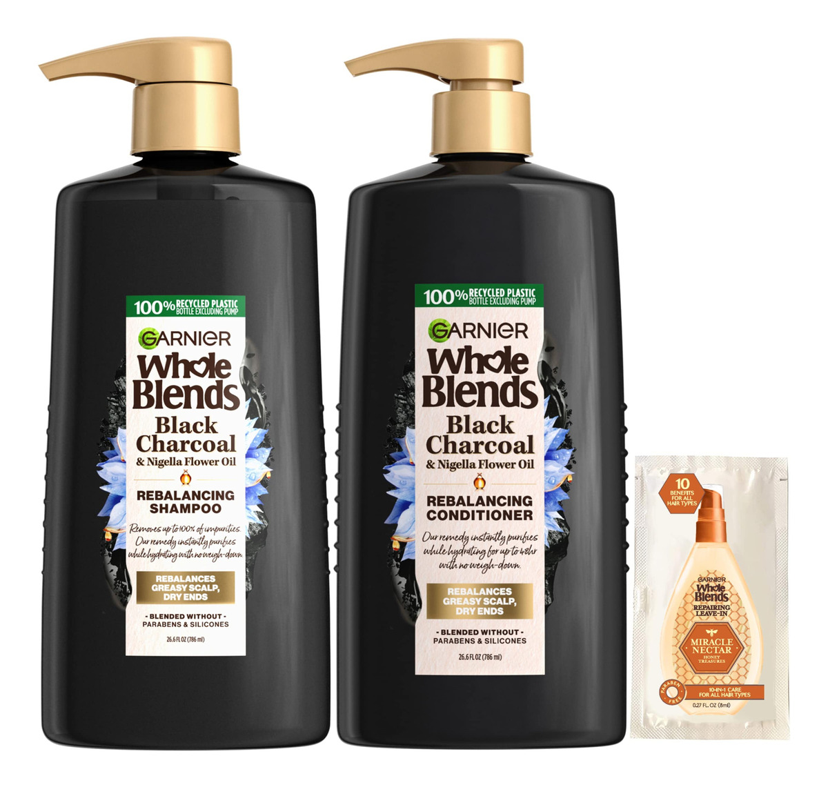 Conjunto de shampoo e condicionador Garnier Whole Blends Black Charcoal & Nigella Flower Oil para couro cabeludo oleoso e pontas secas com amostra, 26,6 fl oz, 1 kit (a embalagem pode variar) — Condicionador Whole Blends: o condicionador Garnier's Black Charcoal e Nigella Flower Oil foi formulado para reequilibrar o couro cabeludo oleoso e nutrir as pontas dos cabelos secos. Oferece até 48 horas de frescor para cabelos que percorrem a distância entre as lavagens – Condicionador de carvão vegetal reequilibrante: formulado para remover até 100 por cento das impurezas enquanto hidrata sem pesar. Para obter melhores resultados, use com nosso shampoo de carvão vegetal. O melhor remédio de ação dupla de shampoo e condicionador para cabelos desidratados – Nourishing Haircare: misturado sem ftalatos, óleos minerais e hidantoína DMDM. Fórmula sem parabenos, sem silicone e vegana, sem ingredientes de origem animal. O frasco de condicionador sem tampa é feito de plástico 100% reciclado – Mais de 100 anos de pioneirismo no cuidado do cabelo: desde 1904, a Garnier combina ingredientes naturais inspirados e derivados em fórmulas inovadoras; nutra seu cabelo com a cor e os cuidados do cabelo da Garnier. Fórmula vegana, sem ingredientes derivados de animais