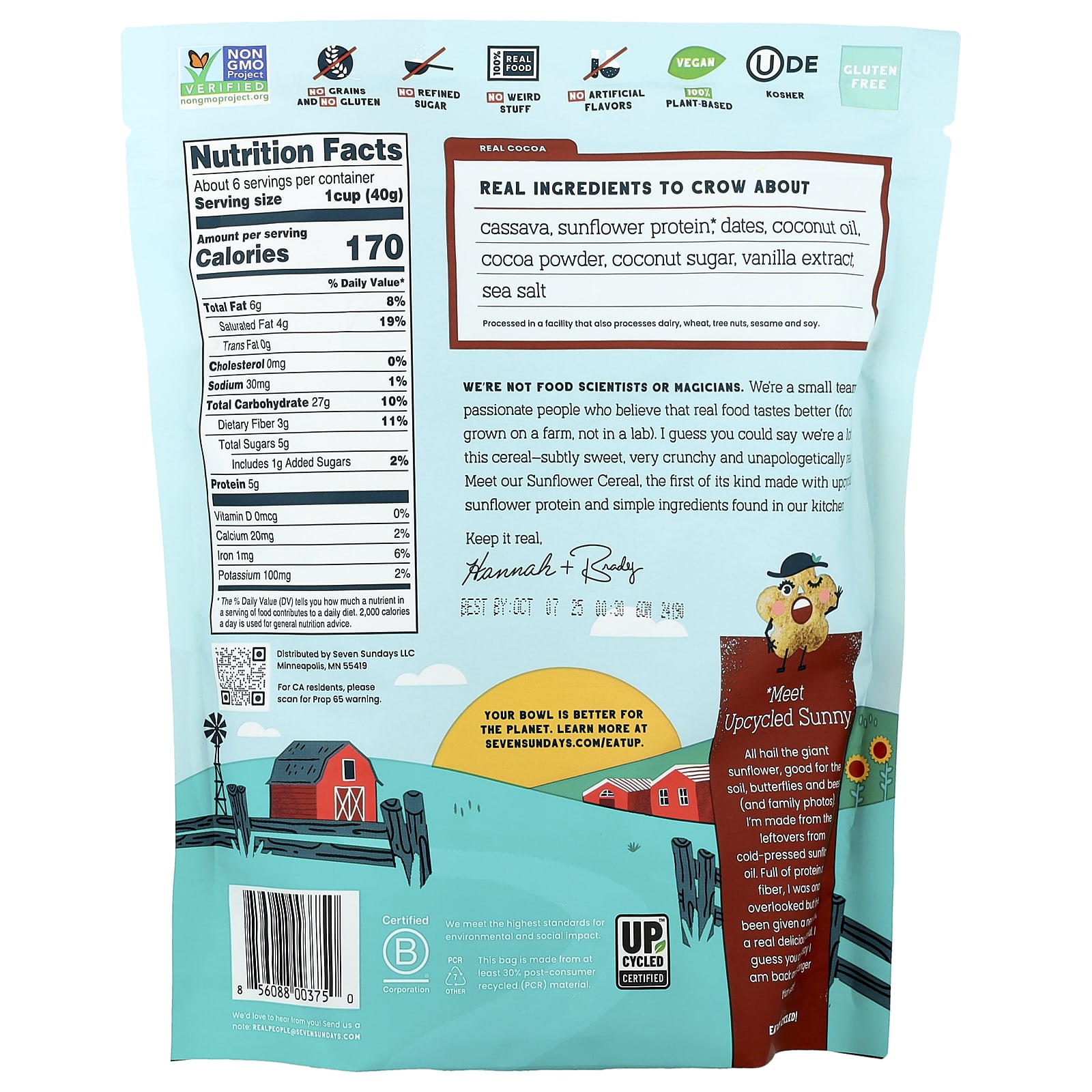 Não somos cientistas nem mágicas da alimentação. Somos uma pequena equipe de pessoas apaixonadas que acreditam que os alimentos de verdade são mais saborosos (alimentos cultivados em uma fazenda, não em um laboratório). Imagino que você possa dizer que somos muito parecidos com este cereal: sutilmente doce, muito crocante e assumidamente real. Conheça nosso Cereal de Girassol, o primeiro do tipo feito com proteína de girassol reaproveitada e ingredientes simples encontrados em nossa cozinha.