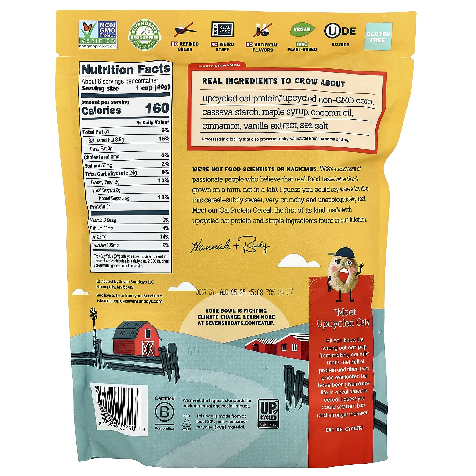 Proteína de aveia reciclada*, milho não OGM reaproveitado, amido de mandioca, xarope de bordo, óleo de coco, canela, extrato de baunilha, sal marinho.