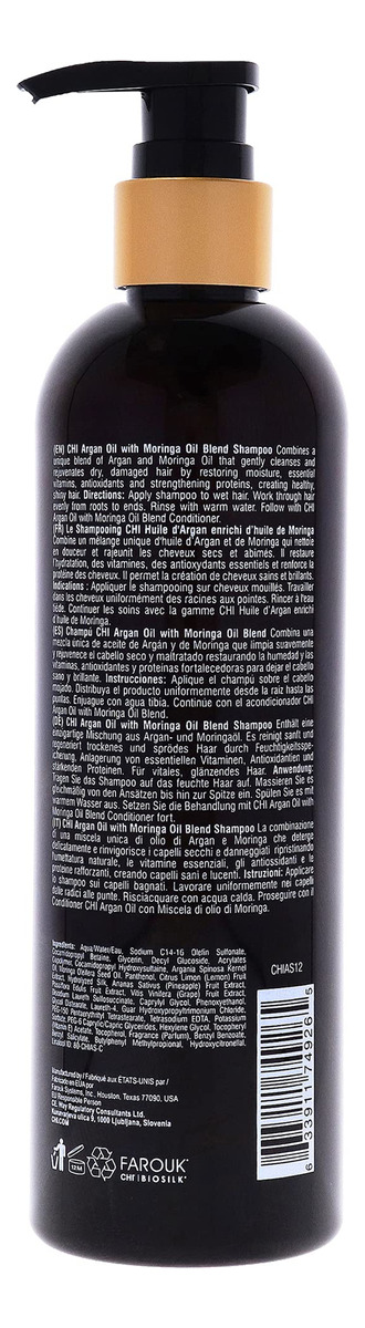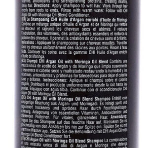 Descrição do produto Chi Argan Oil Shampoo possui compostos cerâmicos CHI, que são naturalmente derivados para rejuvenescer e hidratar cabelos maçante, frizzy e danificados. Este sistema de 4 partes infunde o cabelo com vitamina E, ácidos graxos Ômega e óleos essenciais que fornecem umidade nutritiva e brilho. Os resultados são um acabamento liso, sem frizz e condição de cabelo restaurado. Ideal para cabelos secos, maçante ou danificados que precisem de umidade. Os haircares e ferramentas da Marca Story CHI são fabricados pela Farouk Systems, uma empresa com sede em Houston.