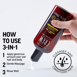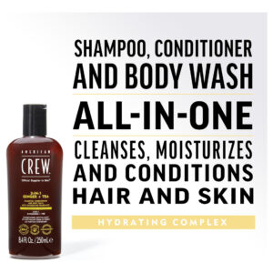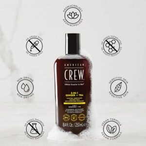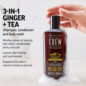 Shampoo, condicionador e sabonete líquido AMERICAN CREW 3 em 1 GINGER + TEA, 33,8 fl oz (pacote com 1) — Limpa e hidrata o cabelo e o corpo enquanto fornece uma espuma rica e luxuosa para remover sujeira, suor e produtos modeladores — A fragrância Ginger + Tea inspirada na aromacologia ajuda você a se sentir acordado, energizado e revigorado. – Apoia e reabastece a barreira de umidade natural da pele. – Feita com 80% de chá após o consumo plástico reciclado.
