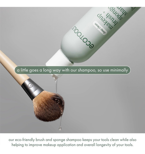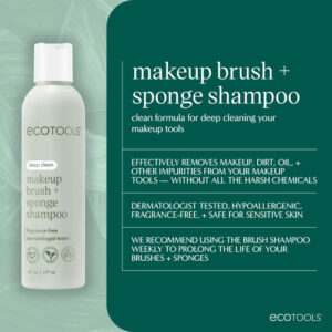 Shampoo de limpeza EcoTools para pincel de maquiagem/esponja/puffs, remove maquiagem e impurezas, sem perfume, sem produtos químicos agressivos, vegano e livre de crueldade, 6 fl.oz./177 ml, 1 unidade. O shampoo EcoTools Makeup Brush + Sponge remove com eficácia a maquiagem, o óleo e outras impurezas de seus pincéis de maquiagem e esponjas de maquiagem para que permaneçam em boas condições para uma aplicação perfeita da maquiagem. Nunca acabe usando o Subscribe & Save – O limpador de pincéis de maquiagem ecológico é livre de produtos químicos agressivos. Sem parabenos, sem ftalatos, sem sulfato e sem ingredientes à base de petróleo, o que o torna seguro para peles sensíveis. Fácil de usar: molhe as cerdas com água, esprema uma pequena quantidade de xampu e esfregue suavemente as cerdas entre os dedos para criar espuma. Enxágue bem. Continue até que a água saia limpa. Esprema o excesso de água, remodele o pincel e deixe secar na horizontal – Recomenda-se usar shampoo com escova semanalmente para limpar profundamente, prolongar a vida útil de seus pincéis e esponjas e evitar que caiam, mantendo-os com aparência e sensação de novos – O xampu para escovas de cabelo é adequado para todos os tipos de escova de cabelo e materiais de esponja para liquidificador de maquiagem – use-os com nossos pincéis de maquiagem EcoTools e esponjas de beleza Bioblender – O limpador de pincéis contém ingredientes de limpeza suaves e eficazes que são melhores para você, testados por dermatologistas, hipoalergênicos, sem fragrâncias e 100% livres de crueldade e Vegan- Os produtos EcoTools nunca são testados em animais