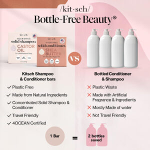 What is it?: Our Bottle-Free Nourishing Shampoo and Conditioner Bars provide a salon quality experience from root to tip. With pure essential oils and bio-based ingredients that perfectly balance the PH in your hair, we can assure youthis is NOT soap. Good For: Dry, color-treated hair needing extra nourishment. Why We Love It: Did you know over 100 million plastic bottles end up in landfills every year? When we learned that, we knew it was time to make a change to reduce plastic waste by starting with something we use all the time, shampoo & conditioner bottles. The first ingredient in most shampoo and conditioner is water. In fact, most bottled products are 90% water. We know what youre thinking, Why do you need so much extra water when youre already in the shower? We were thinking that too, which is why we spent many months finding a way to take those luxury salon-quality ingredients and concentrating them into an aromatic bottle-free bar. When you switch to our Kitsch Shampoo & Conditioner Bars, you save the equivalent of two plastic bottles for every bar! Youre a real-life hero saving the planet by simply switching to Bottle-Free-Beauty. – HIGH-QUALITY HAIR CARE: Formulated with Castor Oil for Hair, pure essential oils and bio-based ingredients that perfectly balance the PH in your hair, Kitsch Pros Castor Oil Shampoo Bar provides a salon-quality experience from root to tip. – BOTTLE FREE SHEA BUTTER CONDITIONER BAR: Our 2.7oz (77g) hair conditioner bar provides salon quality experience from root to tip. With Shea Butter, pure essential oil blend and bio-based ingredients that perfectly balance the PH in your hair for healthy looking locks that feel like silk! – NOURISHING & HYDRATING: Dry & color-treated hair needs extra nourishment, which is why our solid shampoo & conditioner bar for hair is the best choice. Nourishing and moisturizing with bio-based ingredients and a pure essential oil blend, this hair shampoo & conditioner bar will keep your hair soft, strong and shiny. – NO HARSH INGREDIENTS: Kitsch Hair Soap Bar is free of sulfates, parabens, phthalates, silicones, and artificial fragrances and dye to minimize irritation, making it gentle enough for washing your hair on a daily basis. – ZERO-WASTE PACKAGING: Save the equivalent of two plastic bottles for every bar you use! We have spent several months finding a way to take those luxury, salon-quality ingredients and concentrating them into an aromatic, bottle-free bar.