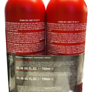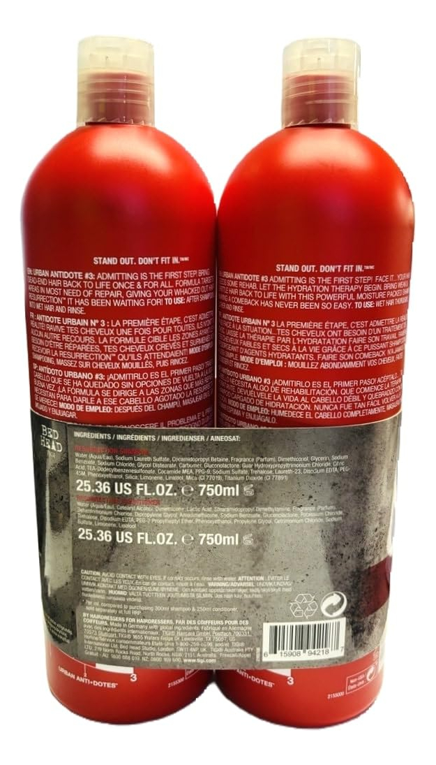 Shampoo e condicionador Tigi Bed Head Urban Anti+dotes Resurrection de nível de dano 3, 25,36 onças (pacote com 2) — Para cabelos esticados que precisam de um toque hidratante — O cabelo fica instantaneamente mais macio e mais gerenciável — Resultados sedosos, macios e brilhantes