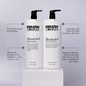 Complexo de queratina — Duo de shampoo e condicionador Blondeshell Debrass — 33,8 fl oz cada — Este conjunto de xampu e condicionador roxo, seguro de cor e especialmente formulado, hidrata o cabelo ao mesmo tempo que adiciona brilho e maciez incríveis