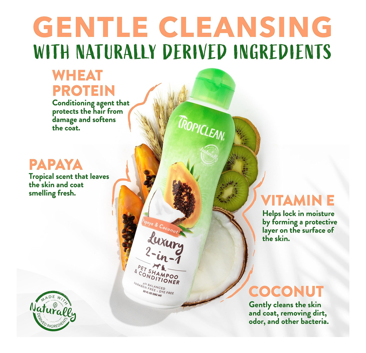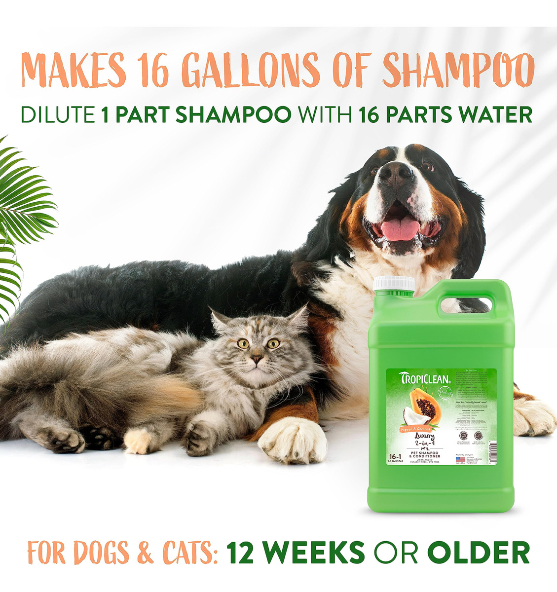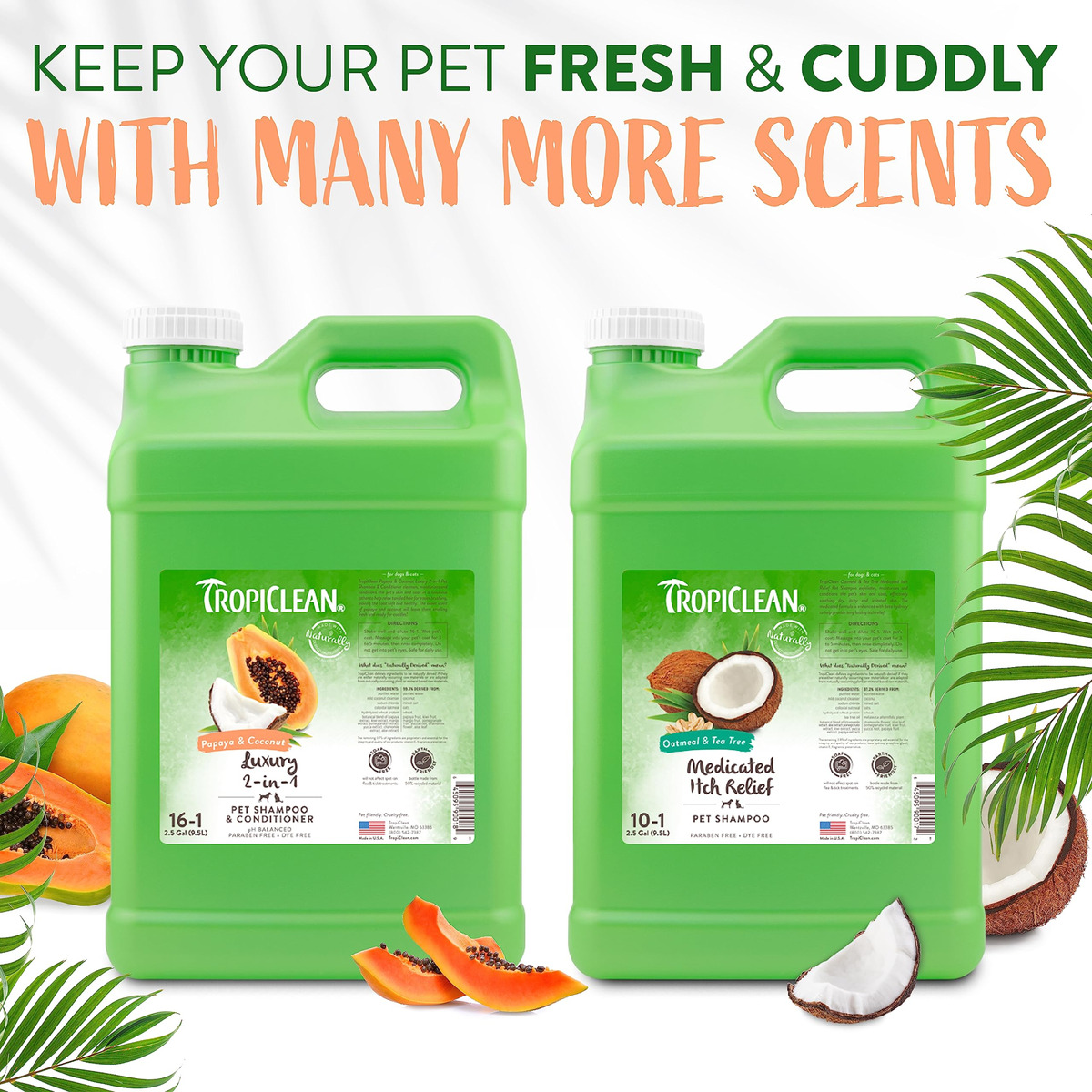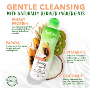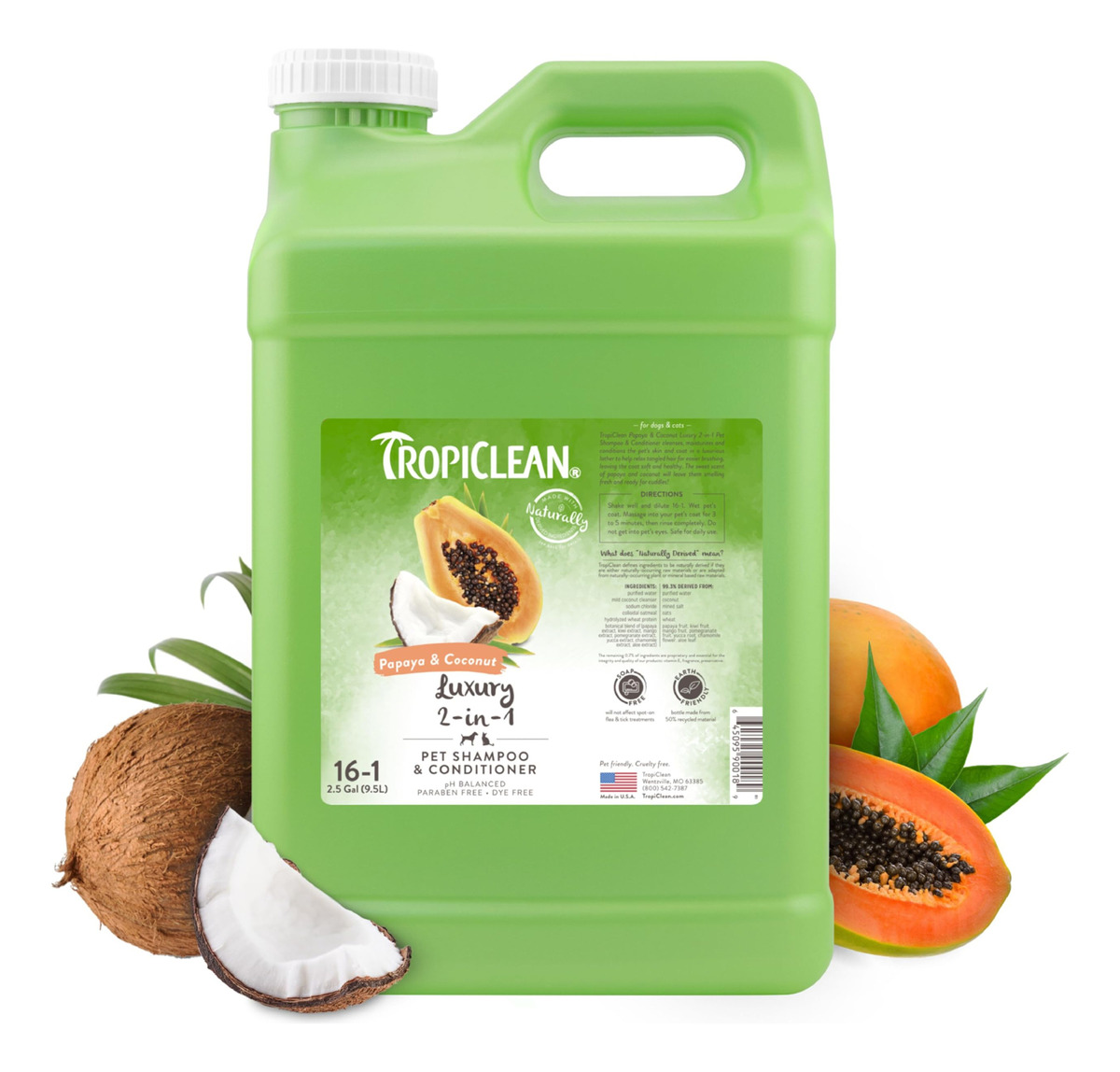 Shampoo e condicionador TropicLean 2 em 1 de mamão e coco para cães | Shampoo natural para animais de estimação derivado de ingredientes naturais | Adequado para gatos | Fabricado nos EUA | 2,5 galões – LIMPA E CONDICIONA O shampoo e condicionador 2 em 1 para cães. Limpa a pelagem de sujeira e detritos enquanto condiciona a pelagem para facilitar a escovação. – CASACO MACIO E SEDOSO Um galão de xampu para cães com bom cheiro que controla o odor e hidrata a pele e o pelo. – INGREDIENTES FÁCEIS DE ESCOVAR. – CASACO MACIO E SEDOSO. Nosso shampoo para animais de estimação é derivado de ingredientes naturais, como coco e vitamina E, para uma pelagem macia e sedosa. – SUAVIZA A PELAGEM Extratos de mamão, kiwi, manga, romã, mandioca, camomila e babosa deixam a pelagem macia e sedosa. – TROPICLEAN Para uma experiência tropical, combine-os com nossos convenientes lenços umedecidos para viagem e desodorizantes cheirosos.
