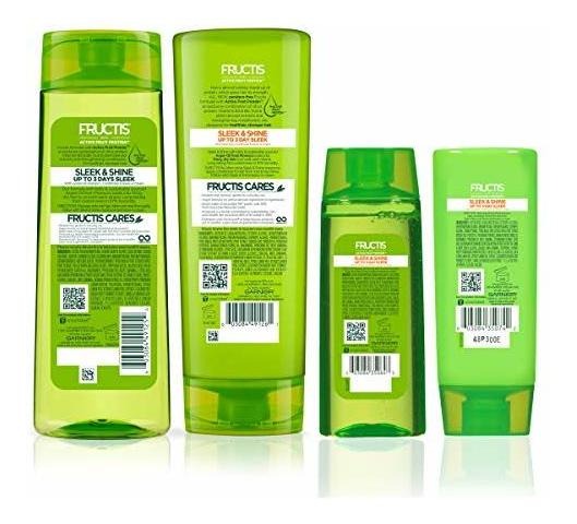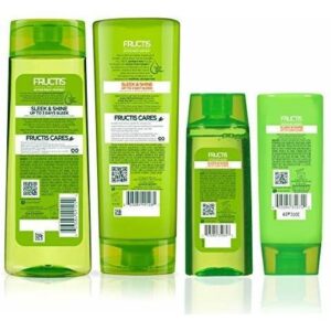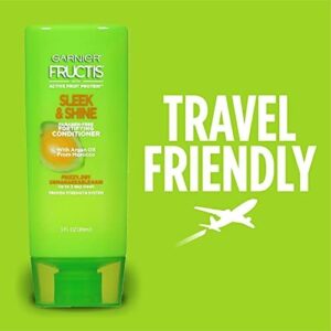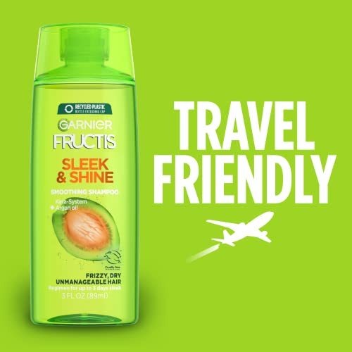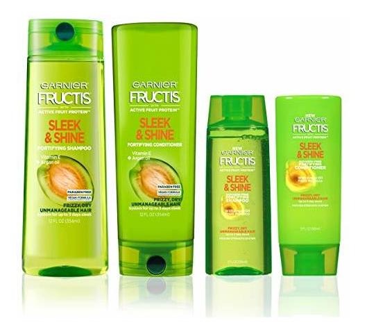 Garnier Fructis Sleek & Shine Full + Travel Size Shampoo (12.5 & 3 Fl Oz) + Conditioner (12 & 3 Fl Oz) Set for Frizzy, Dry Hair, Plant Keratin + Argan Oil (4 Items), 1 Kit (Packaging May Vary) – Infused with plant keratin and sustainably sourced argan oil, Sleek & Shines shampoo and conditioner set fights the frizzy hair battle with up to 72 hours of frizz control (when used with our Sleek & Shine serum or leave-in conditioner) – Our anti frizz shampoo and conditioner set provides you with a set for your home and another set for your travel needs – Garnier is committed to Greener Beauty – our shampoo and conditioner bottles excluding pumps and caps are made of 100% Recycled Plastic – Paraben Free – Leaping Bunny certified, Cruelty Free and Vegan
