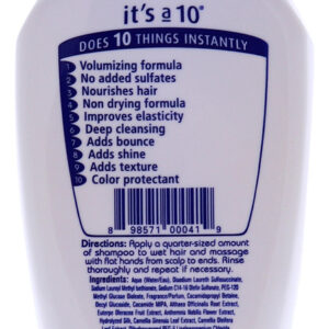 É um shampoo volumizante de 10 milagres que oferece fórmula volumizante, sem sulfato, nutre o cabelo, fórmula que não resseca, melhora a elasticidade, limpa profundamente, adiciona elasticidade, adiciona elasticidade, adiciona brilho, adiciona textura e proteção de cor.