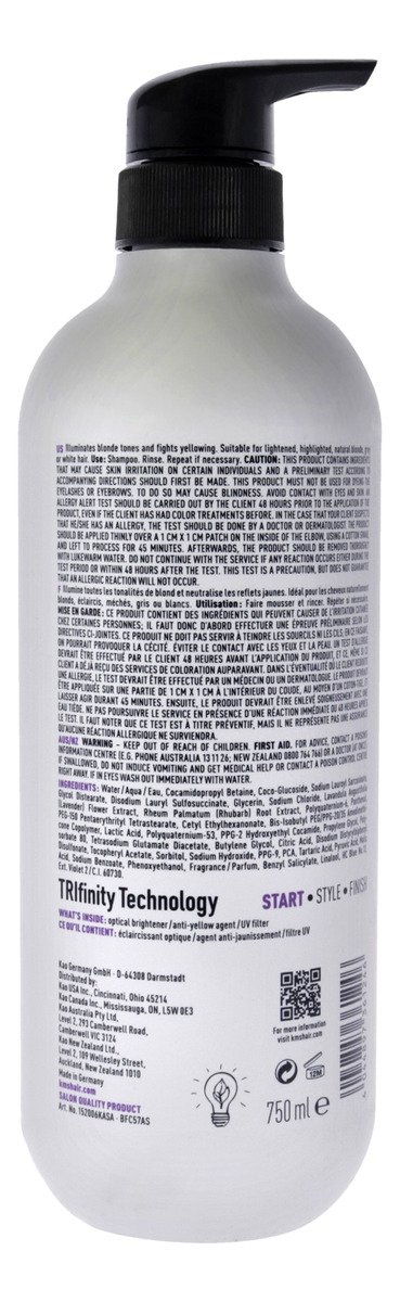 Key Features ——————– 1. **UV Protection**: Contains UV filters to shield hair from harmful sun rays. 2. **Optical Brighteners**: Enhances blonde tones and provides a radiant finish. 3. **Anti-Yellowing Formula**: Effectively fights yellowing in lightened, natural blonde, gray, or white hair. 4. **Suitable for All Blondes**: Ideal for various blonde hues, ensuring vibrant color restoration. 5. **Instant Results**: Delivers noticeable illumination after just one use. Fact Sheet ——————– – Product Volume: 750 mL – Brand: KMS – Type: Blonde Shampoo – Key Ingredients: Rhubarb, Lavender, UV Filters – Purpose: Illuminates and maintains blonde tones while combating yellowing. This KMS Blonde Shampoo offers an exquisite cleansing experience, perfect for those who want to preserve the brilliance of their blonde, gray, or white hair. Infused with invigorating rhubarb and soothing lavender, it nourishes your locks while effectively toning them to prevent yellowing. The advanced formula harnesses UV filters and optical brighteners to enhance the vibrancy of blonde hair, leaving it radiant and luminous. Perfect for all shades of blonde, this shampoo not only beautifies but also protects, making it an essential part of your hair care routine. Enjoy the instant revitalization and renewed shine after every wash, transforming your hair into a vibrant, healthy masterpiece. Make the switch to KMS for radiant color vitality that lasts!