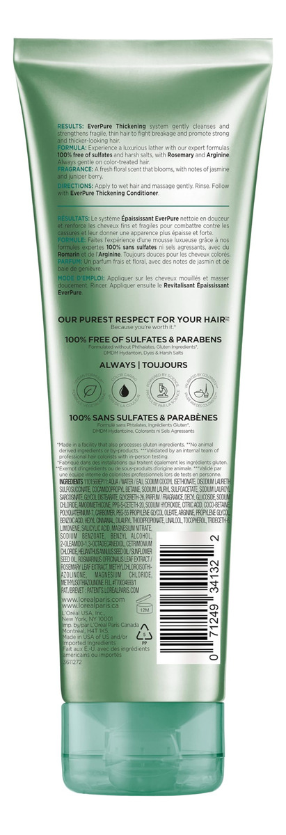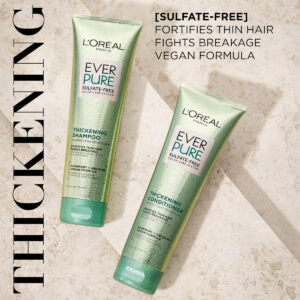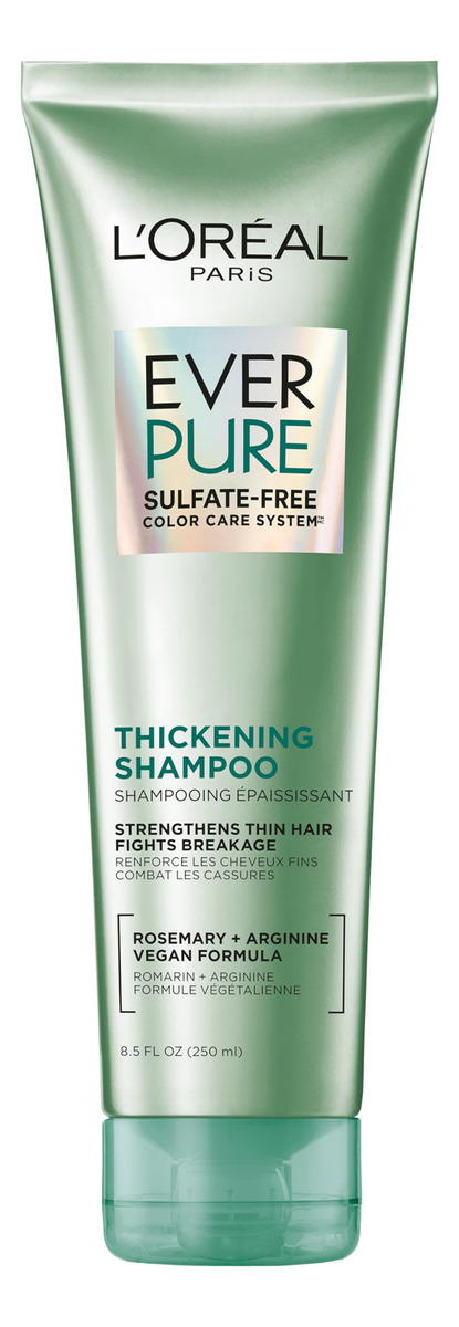 Shampoo espessante sem sulfato L'Oreal Paris, engrossa e fortalece cabelos finos e frágeis, cuida do cabelo com folha de alecrim, EverPure, 8,5 fl oz (a embalagem pode variar) — Fortaleça cabelos finos: promova cabelos mais espessos com este shampoo fortalecedor anti-quebra para cabelos finos e frágeis. O sistema injeta força, reforçando o cabelo para que fique 15 vezes mais forte. * Sistema de xampu, condicionador e tratamento versus shampoo não condicionador – Fórmula suave: especialmente suave para cabelos finos, este shampoo sem sulfato não contém ingredientes agressivos que possam descascar, embaçar e danificar cabelos, com uma espuma exuberante e luxuosa e uma fragrância aromática fresca – O sistema de espessamento EverPure: para obter melhores resultados, use o shampoo e condicionador EverPure Thickening em conjunto, para um sistema nutritivo de tratamento capilar que fortaleça suaviza cabelos finos e frágeis – Shampoo vegano: os produtos para cabelo EverPure têm o mais puro respeito pelo seu cabelo e foram formulados sem sulfatos, parabenos, hidantoína DMDM, adição de ftalatos, corantes e ingredientes de glúten. Sempre cuidando da cor e impulsionada pela ciência – LoRal Paris Innovation: Somos uma empresa de cuidados de beleza que combina a mais recente tecnologia com a mais alta qualidade para obter o máximo em cor de cabelo, cuidados com o cabelo, estilo de cabelo, cuidados com a pele e cosméticos