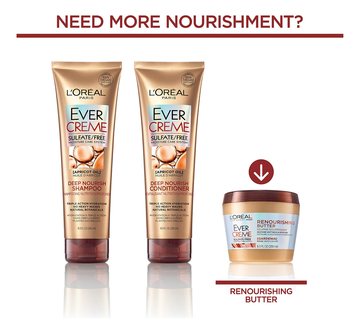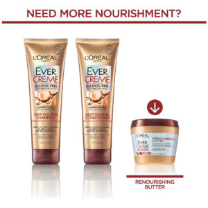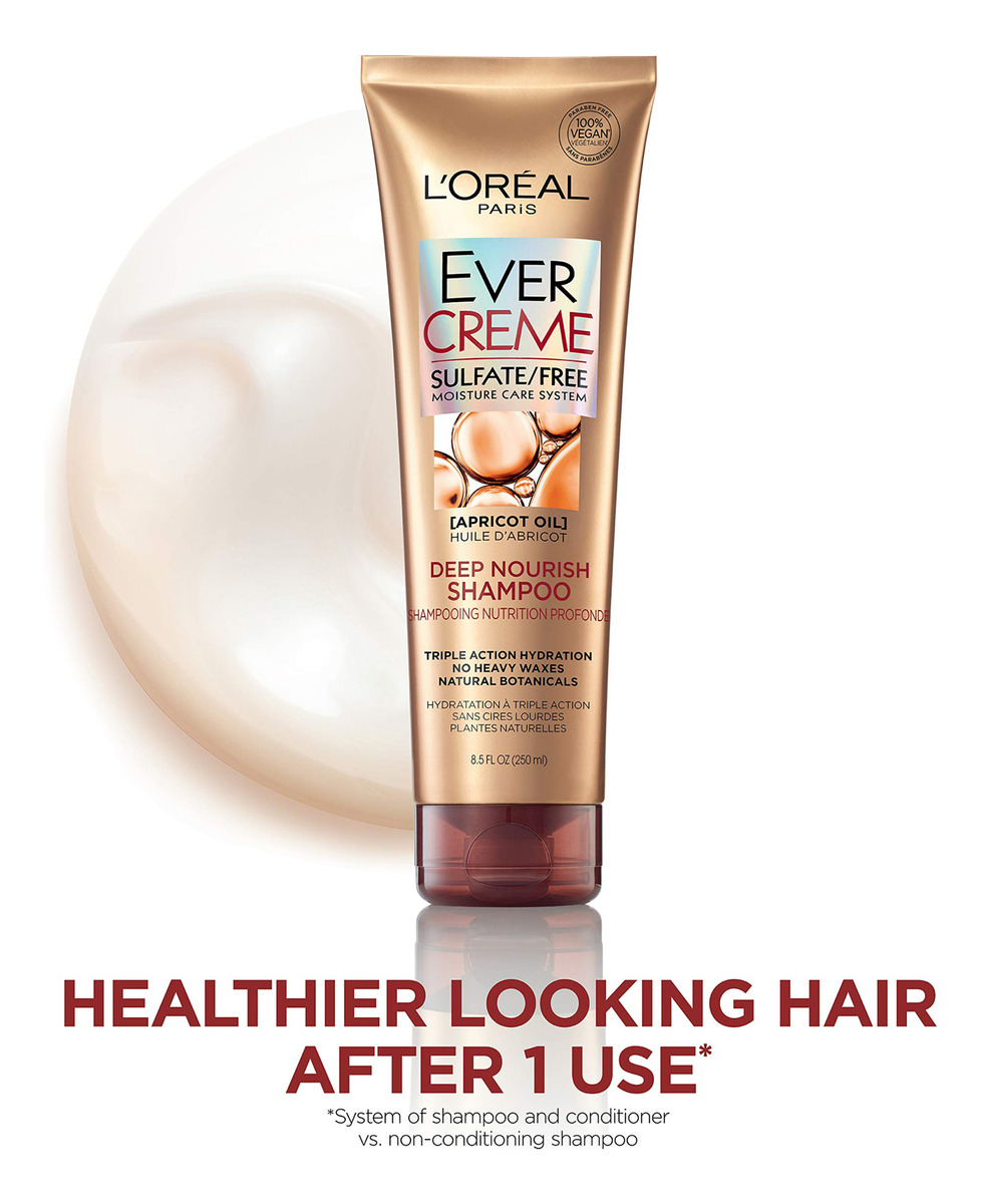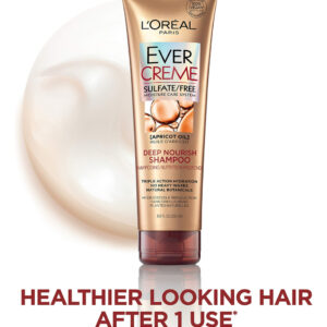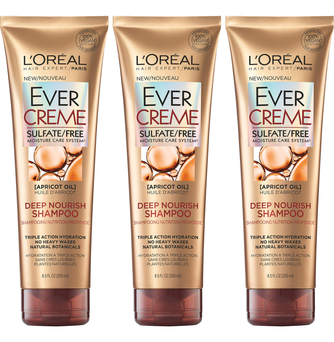 Shampoo de nutrição profunda L'Oreal Paris Hair Care Evercreme sem sulfato, 3 unidades – O shampoo EverCreme Deep Nourish infunde nutrientes essenciais para revitalizar cabelos secos e quebradiços e reabastece a umidade profunda – A fórmula sem sulfato é antidesbotante, não tem sais ou surfactantes que podem descascar, embaçar e danificar o cabelo – O cabelo fica mais saudável após um uso, brilho saudável sem ceras pesadas, sem molhar de baixo para baixo, para uma textura macia e sedosa – O shampoo nutritivo para cabelos secos e quebradiços é infundido com óleo de damasco para uma fragrância fresca e aromática que floresce – Cabelos tratados com cores requerem produtos especiais cuidado, nosso shampoo para cabelos secos e quebradiços é especialmente suave para a cor do seu cabelo
