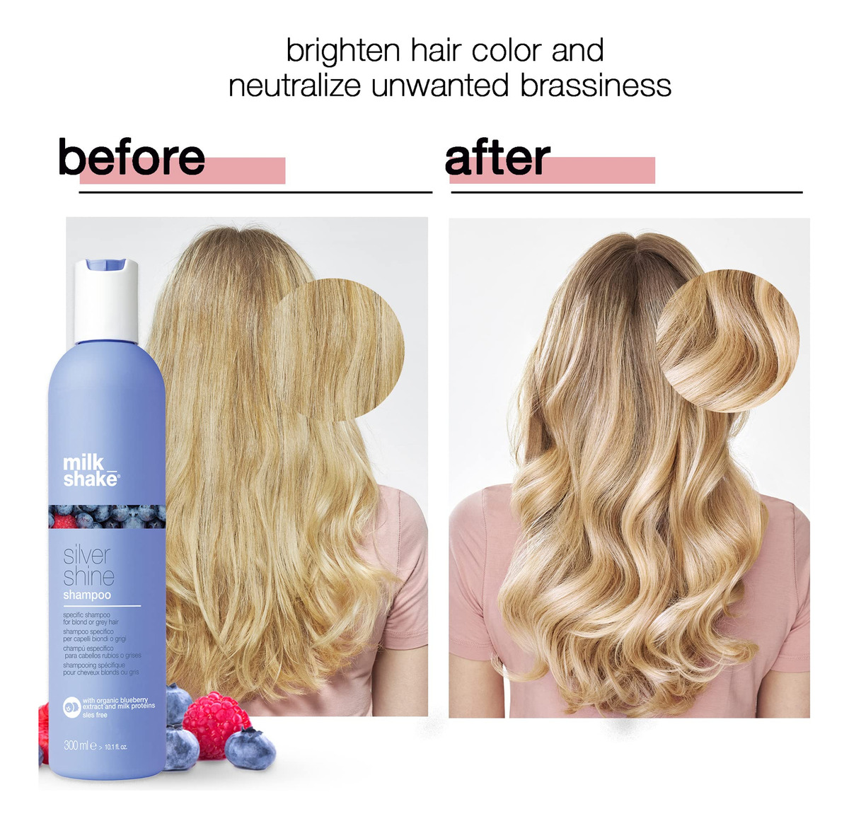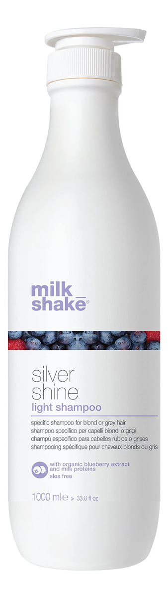 Shampoo milk_shake Silver Shine Light Purple para cabelos loiros – Tônico loiro para cabelos bronzeados – Silver Shine Light é um shampoo tonificante delicadamente formulado para cabelos loiros, que contém um pigmento roxo especial para neutralizar o bronzeado e os tons gerais de amarelo em cabelos loiros, grisalhos ou brancos naturais ou clareados. – A porcentagem reduzida de pigmento violeta em comparação com o shampoo milkshake silver shine original faz com que o milkshake silver shine brilhe O shampoo LIGHT neutraliza moderadamente os tons indesejados de amarelo ou bronzeado: ideal para quem quer um loiro equilibrado e fresco. – A fragrância da linha silver shine é uma experiência gourmand maravilhosa: as notas principais de mirtilo, amora e framboesa se misturam com notas florais de coração. As notas de base são feitas de tons doces e almiscarados que deixam uma fragrância delicada. – Os produtos para cabelo Milkshake são feitos para deixar os cabelos macios, brilhantes e saudáveis. As proteínas do leite em nossas fórmulas protegem a estrutura do cabelo para fortalecer, condicionar e melhorar o brilho do cabelo, enquanto o ingrediente exclusivo Integrity 41 melhora a estabilidade da cor ao longo do tempo. – Os produtos de salão de cabeleireiro profissional Milkshake são recomendados pelos melhores cabeleireiros do mundo todo! Complete sua rotina capilar com a linha de produtos Silver Shine: pacote com condicionador Silver Shine e chantilly.