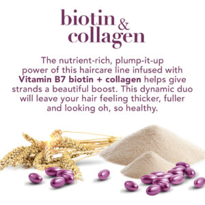 Mistura exclusiva com vitamina B7, biotina, colágeno e proteína de trigo, infunde nutrientes em cada fio, para cabelos mais grossos e cheios.