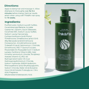 Apoiado pela ciência: contém proteoglicanos altamente concentrados do salmão nasal que auxilia o crescimento e o comportamento cíclico dos folículos pilosos. Os proteoglicanos contêm um teor muito alto de colágeno, que demonstrou aumentar as proteínas de construção capilar do corpo e reduzir a aparência de cabelos grisalhos. O envolvimento dos proteoglicanos no crescimento do cabelo foi reconhecido através da observação do aumento do crescimento capilar. Estimule o couro cabeludo: o couro cabeludo é como terra para o cabelo, portanto, um couro cabeludo saudável ajudará a nutrir fios fortes. Nossa poderosa solução de shampoo desintoxica e fornece nutrientes essenciais para hidratar e fortalecer o couro cabeludo. Reabastecer e restaurar: este shampoo funciona como um fortalecedor de união. Sua mistura poderosa ajuda a abrir os pequenos poros do couro cabeludo e, portanto, reduzir o crespo do cabelo, reparar pontas duplas e cabelos danificados e remover a caspa. Shampoo de rotina: o shampoo Thik&Fix é suave o suficiente para ser usado todos os dias. É um shampoo leve e seguro para todos os tipos de cabelo, incluindo cabelos oleosos, encaracolados, ondulados e lisos. Limpe suavemente o cabelo e nutra os folículos capilares na raiz. – [Apoiado pela ciência] Contém proteoglicanos altamente concentrados de salmão que apoiam o crescimento e o comportamento cíclico dos folículos pilosos. Os proteoglicanos contêm um teor muito alto de colágeno, o que demonstrou aumentar as proteínas de construção capilar do corpo e reduzir a aparência de cabelos grisalhos. O envolvimento dos proteoglicanos no crescimento do cabelo foi reconhecido pela observação do aumento do crescimento do cabelo. – [Estimule o couro cabeludo] O couro cabeludo é como terra para o cabelo, portanto, um couro cabeludo saudável ajudará a nutrir fios fortes. Nossa poderosa solução de shampoo desintoxica e fornece nutrientes essenciais para hidratar e fortalecer o couro cabeludo. – [Reabastecer e restaurar] Este shampoo funciona como um fortalecedor de união. Sua mistura poderosa ajuda a abrir os pequenos poros do couro cabeludo, reduzindo o crespo do cabelo, reparando pontas duplas e cabelos danificados e removendo a caspa. – [Shampoo de rotina] O shampoo Thik&Fix é suave o suficiente para ser usado todos os dias. É um shampoo leve e seguro para todos os tipos de cabelo, incluindo oleoso, encaracolado, ondulado e liso. Limpe suavemente o cabelo e nutra os folículos capilares na raiz. – [Reabastecer e restaurar] Este produto tem um aroma leve para homens. Para obter melhores resultados, recomendamos usar shampoo pelo menos quatro vezes por semana durante dez semanas. Confira nosso spray de cabelo e suplementos dietéticos para obter mais soluções anti-queda de cabelo!