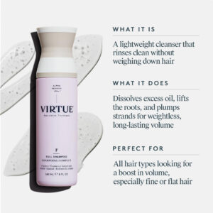 O shampoo volumizante Virtue Full Sulfate Free engrossa o cabelo, é seguro para todos os tipos de cabelo, não causa cor — Infundido com nossa primeira proteína Alpha Keratin 60ku, o shampoo e condicionador completos foram desenvolvidos especificamente para adicionar volume e densidade aos fios de cabelo finos e flácidos. Essas fórmulas extraordinariamente leves ajudam a aumentar o volume de dentro para fora e continuarão a melhorar a saúde do cabelo ao longo do tempo. – O QUE É: Uma espuma leve e rendada que enxagua sem descascar ou desidratar o cabelo. – Fragrância: uma mistura floral cítrica revitalizante de folhas verdes, flores e frutas, incluindo notas de pêra branca, folhas estimulantes de hortelã e óleos essenciais brilhantes de limão. – Para todos os tipos de cabelo para aumentar o volume ou a densidade dos fios. Seguro para cabelos tratados com cores e quimicamente tratados. – Livre de sulfatos, parabenos, ftalatos, cores e corantes sintéticos. Sem glúten. Livre de crueldade.