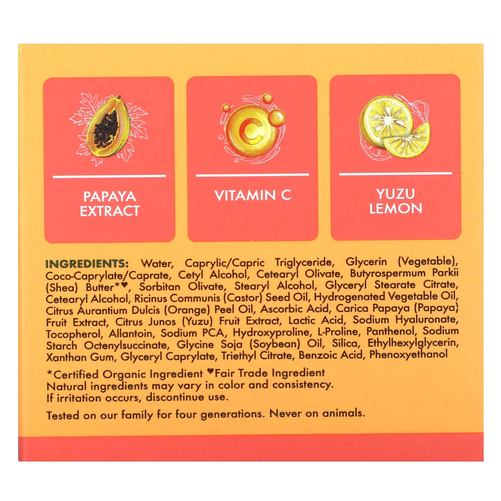 Água, caprylic/capric triglyceride, glicerina (vegetal), coco-caprilato / caprato, álcool cetílico, cetearyl olivate, manteiga de Butyrospermum parkii (karité)*^, sorbitan olivate, álcool estearílico, citrato de estearato de glicerila, álcool cetearílico, óleo da semente de Ricinus communis (rícino), óleo vegetal hidrogenado, óleo da casca de Citrus aurantium dulcis (laranja), ácido ascórbico, extrato da fruta de Carica papaya (mamão), extrato da fruta de Citrus junos (yuzu), ácido láctico, hialuronato de sódio, tocoferol, alantoína, pidolato de sódio, hidroxiprolina, l-prolina, pantenol, sodium starch octenylsuccinate, óleo de Glycine soja (soja), sílica, etilhexilglicerina, goma xantana, caprilato de glicerila, citrato de trietila, ácido benzoico, fenoxietanol.