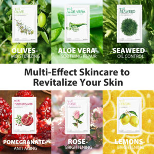 Pacote com 12 máscaras de lençol variado — hidratantes e suavizantes, hidratantes e nutritivas para todos os tipos de pele — Pacote variado de máscaras faciais: aloe vera, romã, algas marinhas, rosa, limão e azeitonas — Vantagens: feitas de tencel, essas máscaras são mais macias e se ajustam melhor. Eles ajudam a restaurar a elasticidade da pele, evitar a oxidação e hidratar a pele sensível – Para todos os tipos de pele: ideais para peles secas, opacas e com linhas finas. Essas máscaras tornam sua pele mais macia, hidratada e saudável. Cada máscara aborda problemas específicos da pele, fornecendo hidratação e melhorando a saúde geral da pele. Fácil de usar: adequada para todos os tipos de pele. Cada máscara é embalada individualmente para maior comodidade, perfeita para uso a qualquer hora e em qualquer lugar. Ótimo presente: ideal para uso diário, festas, casamentos ou viagens. Um presente perfeito para amigos, familiares e entes queridos