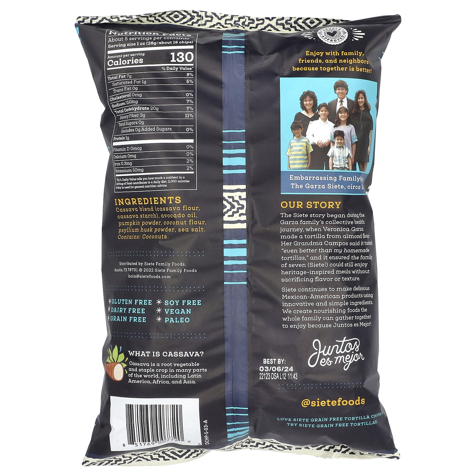 A história da Siete começou durante a jornada de saúde coletiva da família Garza, quando Veronica Garza fez uma tortilha com farinha de amêndoa. Sua avó Campos disse que o sabor era “ainda melhor do que as minhas tortilhas caseiras” e garantia que a família de sete pessoas (Siete!) ainda pudessem desfrutar de refeições inspiradas na herança sem sacrificar o sabor ou a textura.