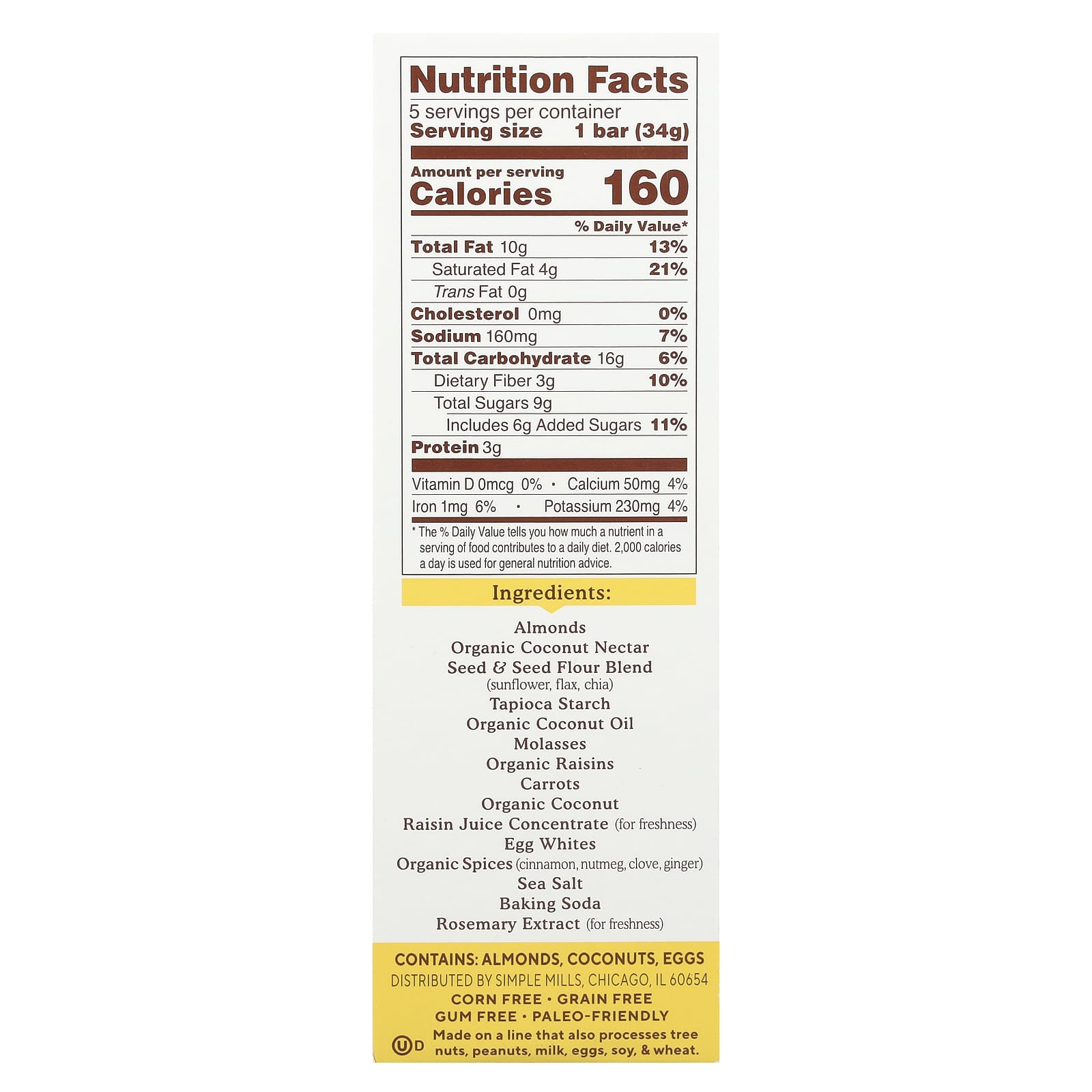 Simple Mills Barras com Farinha de Amêndoas Levemente Assadas Bolo de Cenoura Apimentado 5 Barras 34 g (119 oz) Cada – Simple Mills Alimentos Barras Barrinhas para lanche.