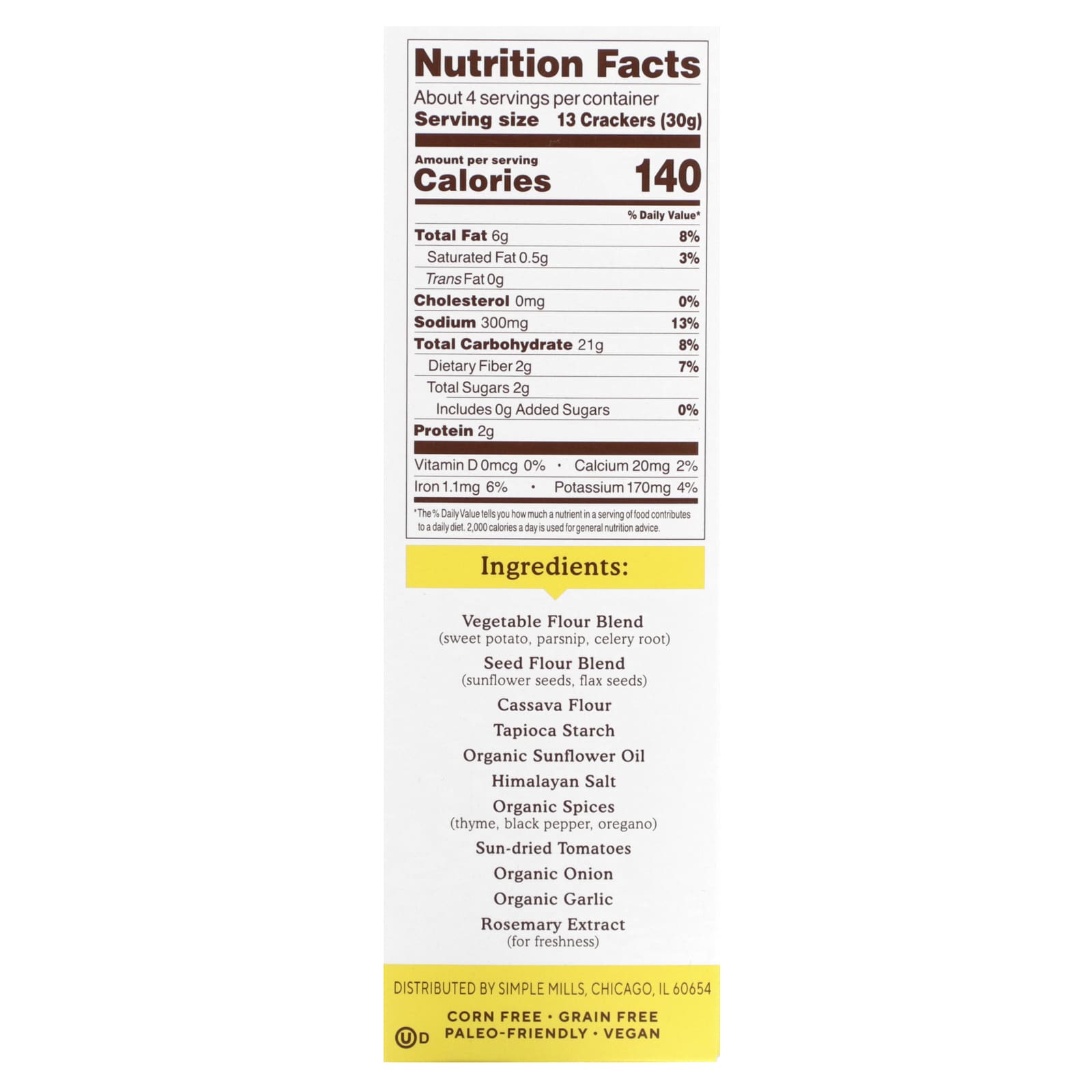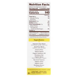 Mistura de farinha de vegetais (batata-doce, pastinaca, raiz de aipo), mistura de farinha de sementes (sementes de girassol, sementes de linhaça), farinha de mandioca, amido de tapioca, óleo de girassol orgânico, sal do Himalaia, especiarias orgânicas (tomilho, pimenta-do-reino, oregano), tomates secos ao sol, cebola orgânica, alho orgânico, extrato de alecrim (para proporcionar frescor).