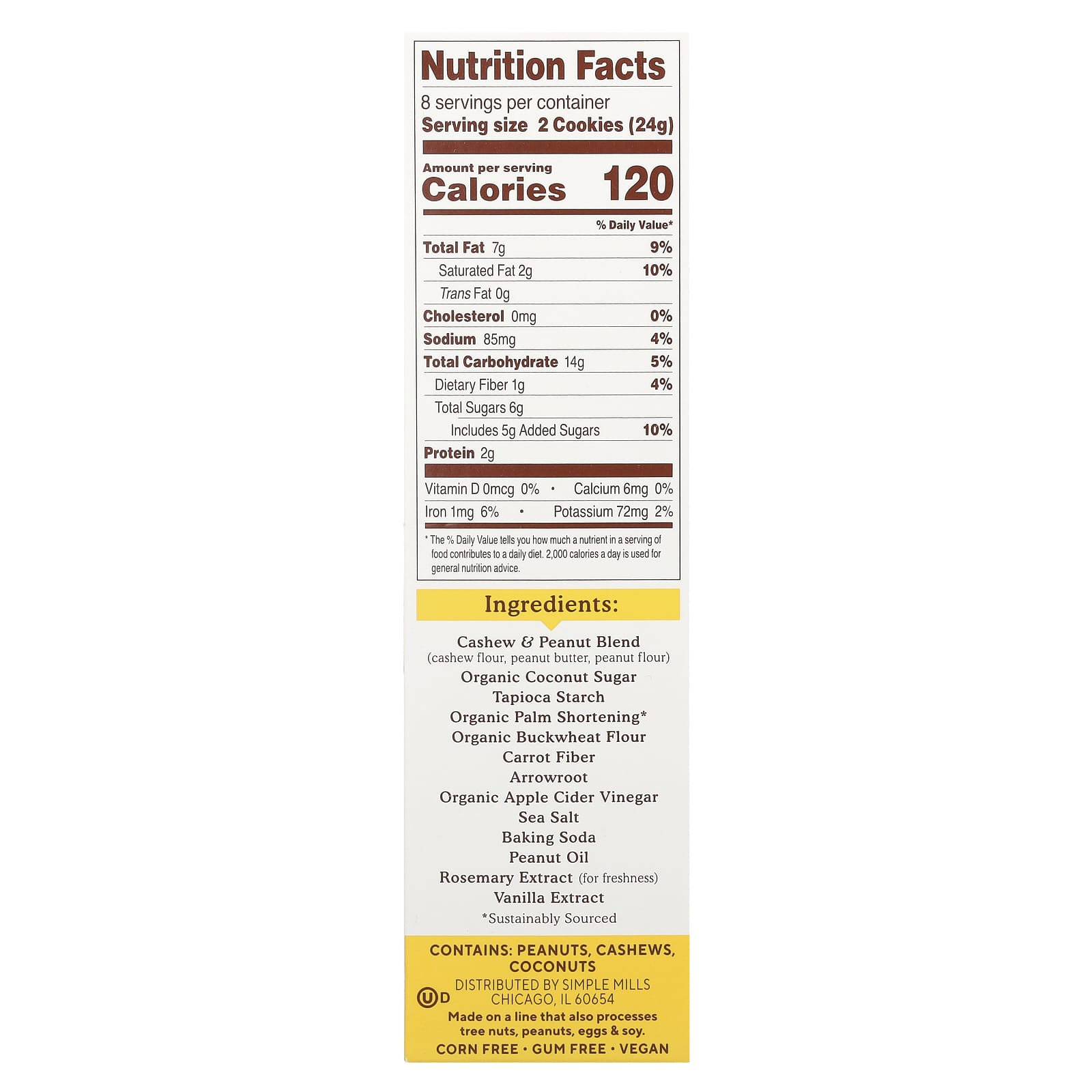 Caju e & mistura de amendoim (farinha de caju, manteiga de amendoim, farinha de amendoim), açúcar de coco orgânico, amido de tapioca, redução de palma orgânica*, farinha de trigo sarraceno orgânico, fibra de cenoura, araruta, vinagre de sidra de maçã orgânico, sal marinho, bicarbonato de sódio, óleo de amendoim, extrato de alecrim (para proporcionar frescor), extrato de baunilha.