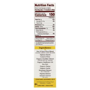 Mistura de farinha de nozes e sementes (amêndoas, sementes de girassol, sementes de linho), tapioca, mandioca, queijo cheddar orgânico (leite refinado, sal, enzimas), óleo de girassol orgânico, sal marinho, cebola orgânica, alho orgânico, extrato de alecrim (para frescura) , páprica e extrato de urucum (para cor).
