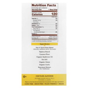 Mistura de farinha de sementes e frutos secos (amêndoas, sementes de girassol, sementes de linhaça), amido de tapioca, farinha de mandioca, óleo de girassol orgânico, sal marinho, cebola orgânica, alho orgânico, extrato de alecrim (para proporcionar frescor).