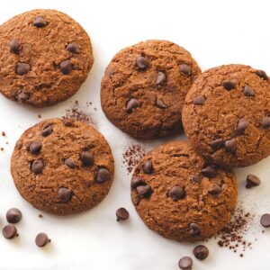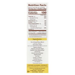 Mistura de farinha de sementes e frutos secos (amêndoas, sementes de linhaça), gotas de chocolate (açúcar de cana, chocolate não adoçado, manteiga de cacau), amido de tapioca, açúcar de coco orgânico, redução de palma orgânica*, araruta, cacau holandês em pó, bicarbonato de sódio, sal marinho, creme de tártaro, extrato de baunilha, extrato de alecrim (para proporcionar frescor).
