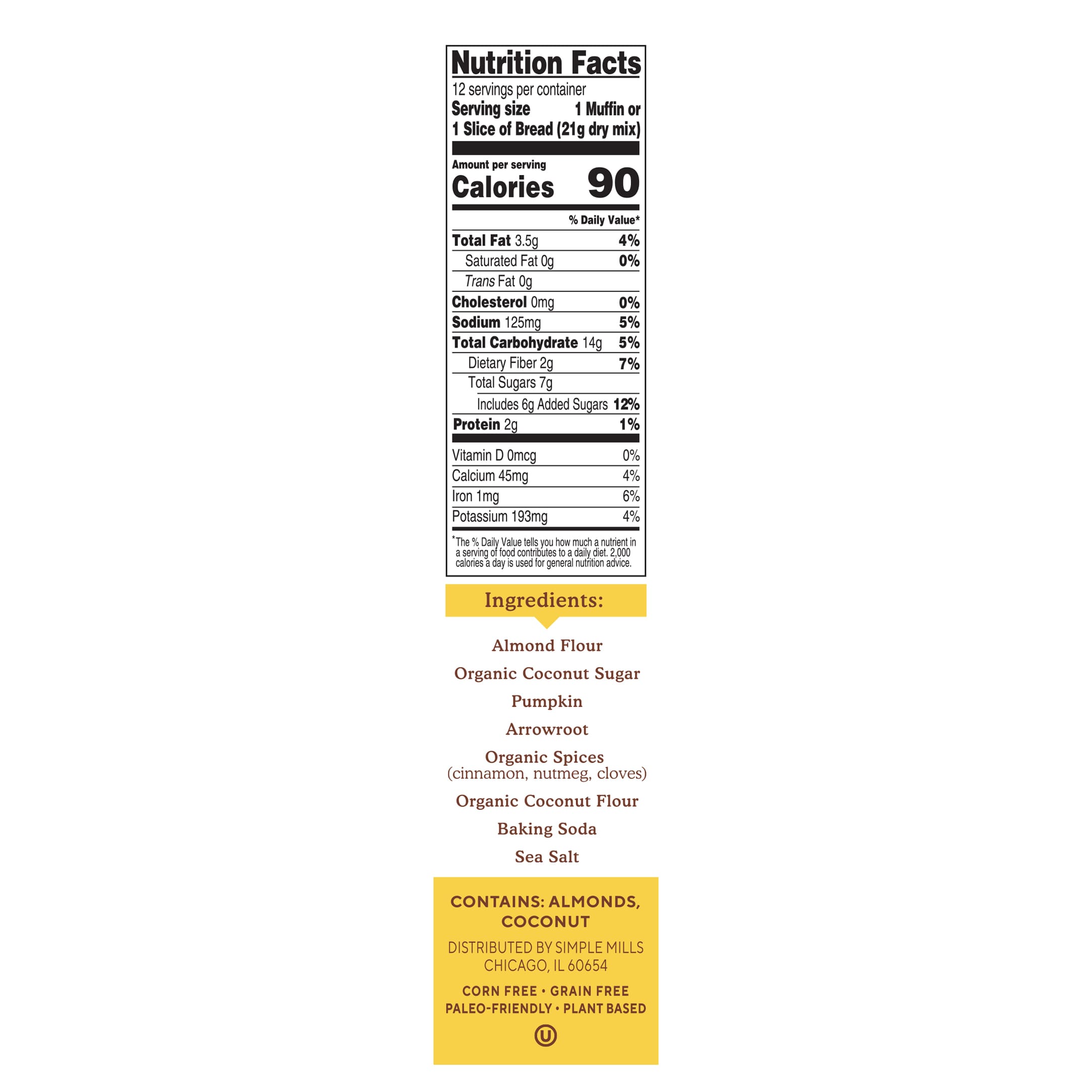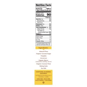 Farinha de amêndoas, açúcar de coco orgânico, abóbora, araruta, especiarias orgânicas (canela, noz-moscada, cravos), farinha de coco orgânico, bicarbonato de sódio, sal marinho.