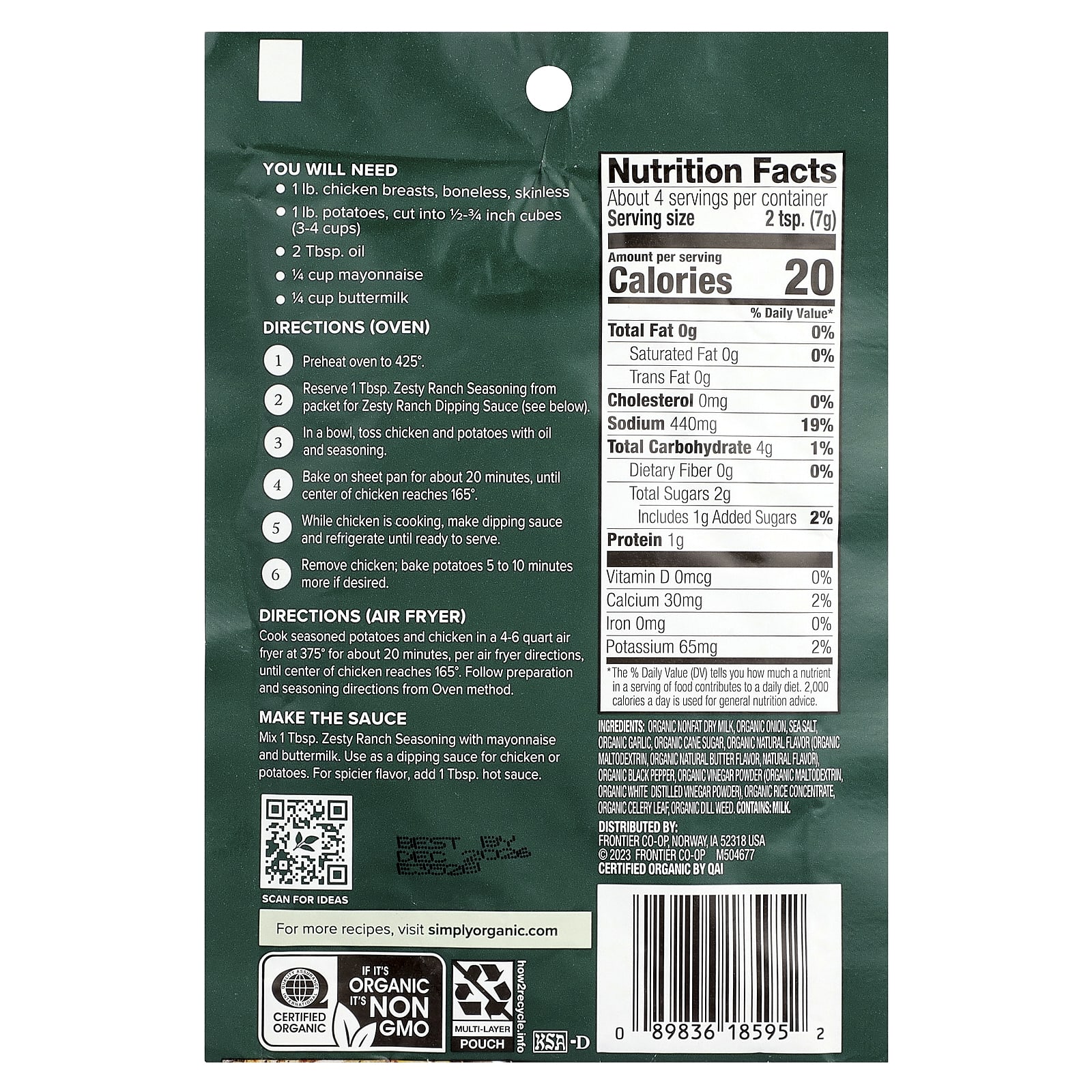 Este pacote de Temperos da Zesty Ranch permite que você crie duas coisas com um único pacote: frango e batatas habilmente temperados e um molho cremoso do molho ranch que combina muito bem com os dois. Ervas e especiarias orgânicas ousadas, como endro, cebola e folha de aipo, se combinam para formar uma base tradicional do rancho, enquanto o vinagre em pó e o alho contribuem para um pouco de sabor picante. Este atalho em assadeira dupla é um tempero saboroso para frango e batatas. Misture o sour cream e o leitelho com uma porção do tempero para criar um Molho Rancho Picante para ser saboreado com o frango e as batatas.
