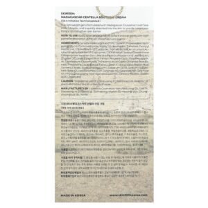 Extrato de Centella asiatica(72%), glicerina, propanodiol, dipropilenoglicol, ciclometicona, água, 1,2-hexanediol, trealose, caprylyl methicone, c12-14 pareth-12, carbômer, trometamol, amonium acryloyldimethyltaurate/vp copolymer, crospolímero de c30-45 alkyl cetearyl dimethicone, goma xantana, extrato da folha de Mentha piperita (hortelã-pimenta), extrato da raiz de Zingiber officinale (gengibre), butilenoglicol, ethylhexylglycerin, glicerizato de dipotássio, ácido tranexâmico, extrato da raiz de Coptis chinensis, extrato de Theobroma cacao (cacau), dextrina, filtrado da fermentação da raiz de rabanete/leuconostoc, goma de biossacarídeo-1, edetato dissódico, hialuronato de sódio, betaglucano, ceramida EOP, ceramida NS, ceramida np, ceramida AP, fitoesfingosina, lecitina hidrogenada, álcool cetoestearílico, ácido esteárico, colesterol.