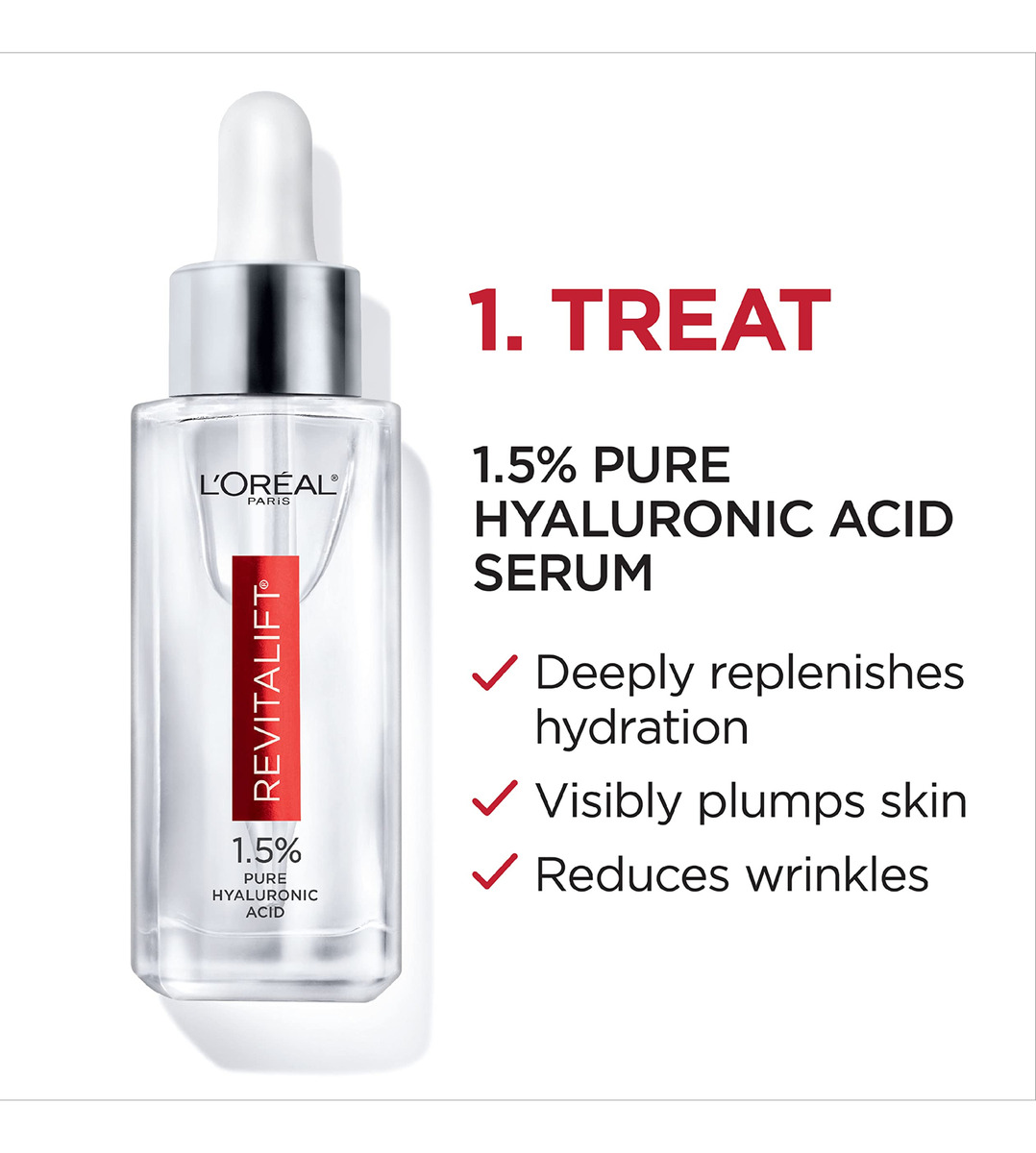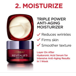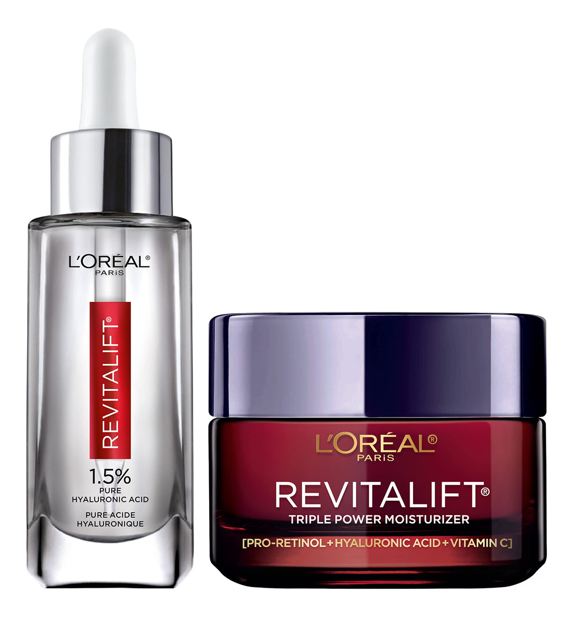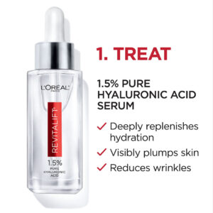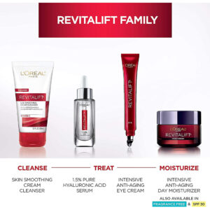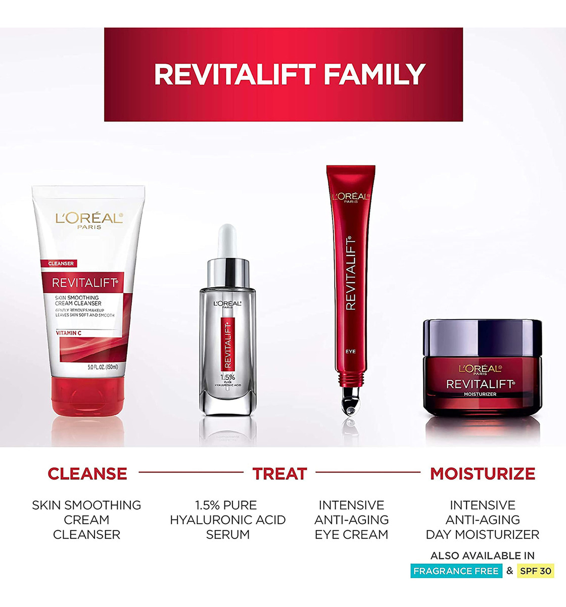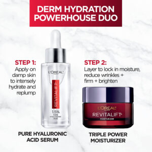 Sérum facial L'Oreal Paris Revitalift com 1,5% de ácido hialurônico puro + hidratante facial antienvelhecimento Triple Power, 1 kit – Anti-Aging Power Duo – Trate sua pele com esses dois favoritos do cuidado com a pele Revitalift – Sérum facial Derm Intensives com ácido hialurônico puro de 1,5% com vitamina C para hidratar e reabastecer; hidratante triplo para reduzir rugas, firmar e iluminar a pele – Hidratante intensivo de 1,5 por cento puro Hyalurônico O sérum de ácido alurônico para rosto com vitamina C hidrata a pele instantaneamente para um brilho úmido e uma pele visivelmente volumosa; reduz as rugas e aumenta o brilho da pele; Eficaz para todos os tons de pele — alívio instantâneo para pele seca; em 1 semana, deixa a pele visivelmente mais jovem, mais firme, mais elástica e radiante; a pele fica úmida instantaneamente e com o passar do tempo; o sérum é livre de fragrâncias, parabenos, sem óleo mineral, não obstrui os poros — Hidratante antienvelhecimento de potência tripla com pró-retinol, ácido hialurônico e vitamina C aborda os principais sinais de envelhecimento da pele; Reduz as rugas, refirma os contornos, ilumina a pele e hidrata para uma pele com aparência mais jovem em 1 semana; use de dia ou de noite no rosto e pescoço – Com Revitalift Skin Care você pode adicionar um benefício antienvelhecimento a qualquer etapa do cuidado da pele; após a limpeza, trate a pele com o sérum facial de ácido hialurônico puro Revitalift Derm Intensives de 1,5% e hidrate com o hidratante antienvelhecimento Triple Power