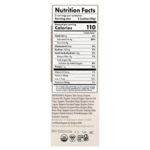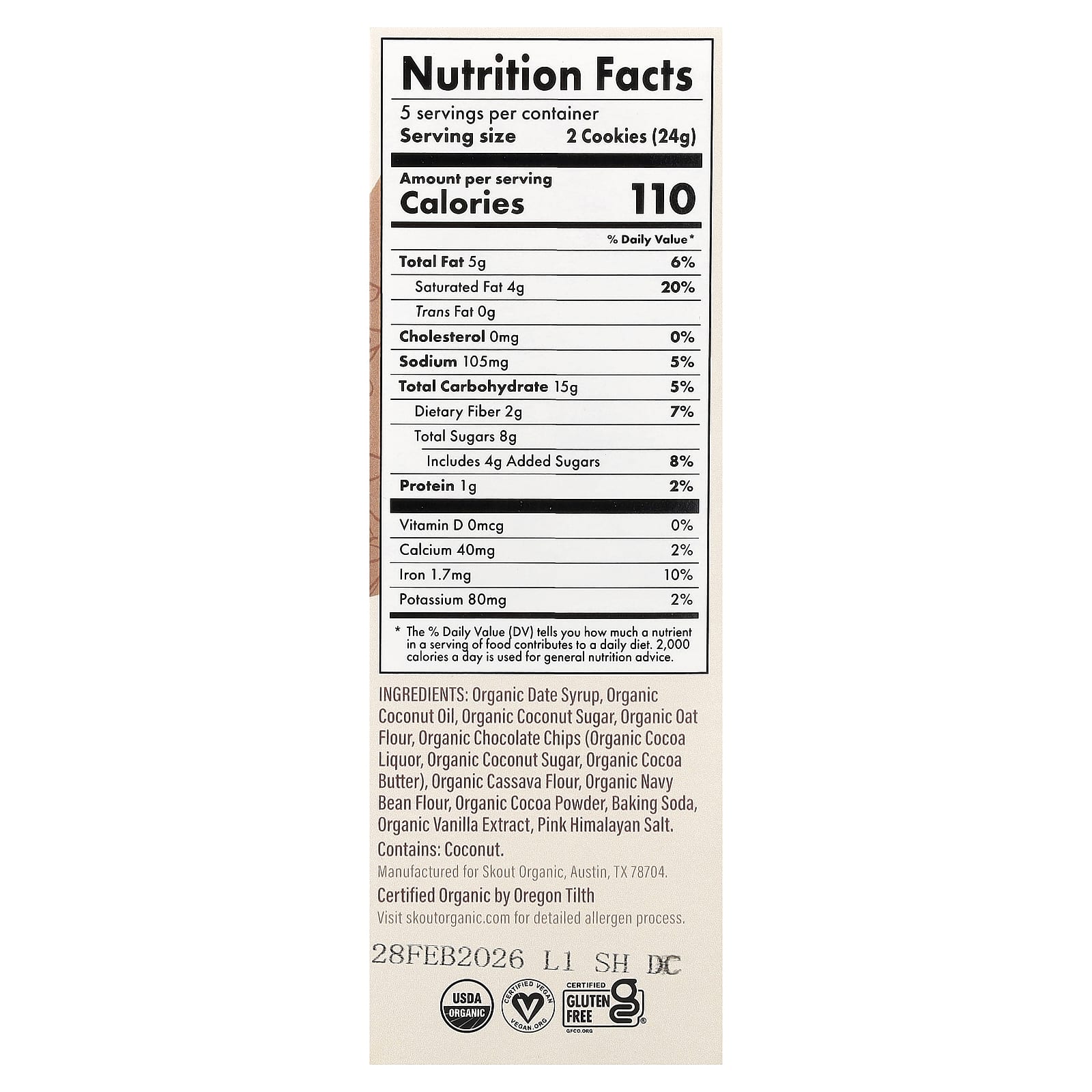 Xarope de tâmara orgânica, óleo de coco orgânico, açúcar de coco orgânico, farinha de aveia orgânica, gotas de chocolate orgânico (liquor de cacau orgânico, açúcar de coco orgânico, manteiga de cacau orgânico), farinha de mandioca orgânica, farinha de feijão-bravo orgânico, cacau em pó orgânico, bicarbonato de sódio, extrato de baunilha orgânica, sal rosa do Himalaia.