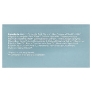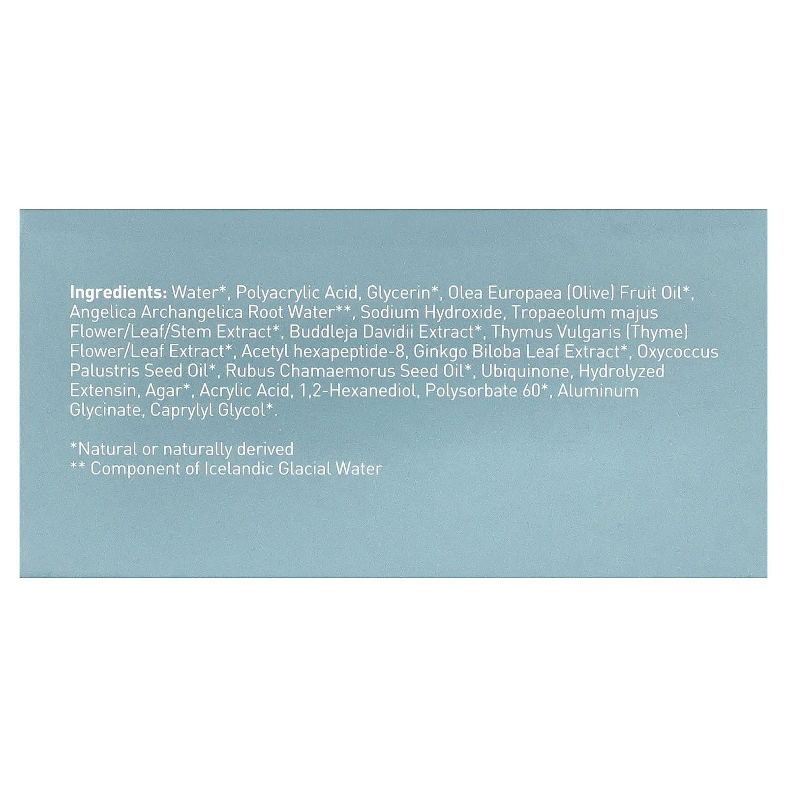 Água*, polyacrylic acid, glicerina*, óleo da fruta de Olea europaea (azeitona)* água da raiz de Angelica archangelica**, hidróxido de sódio, extrato da flor/folha/caule de Tropaeolum majus*, extrato de Buddyja davidii*, extrato da flor/folha de Thymus vulgaris (tomilho)*, acetyl hexapeptide-8, extrato da folha de Ginkgo biloba*, óleo da semente de Oxycoccus palustris*, óleo da semente de Rubus chamaemorus*, ubiquinona, extensina hidrolisada, agar*, ácido acrílico, 1,2-hexanediol, polissorbato 60*, glicinato de alumínio, caprylyl glycol*.