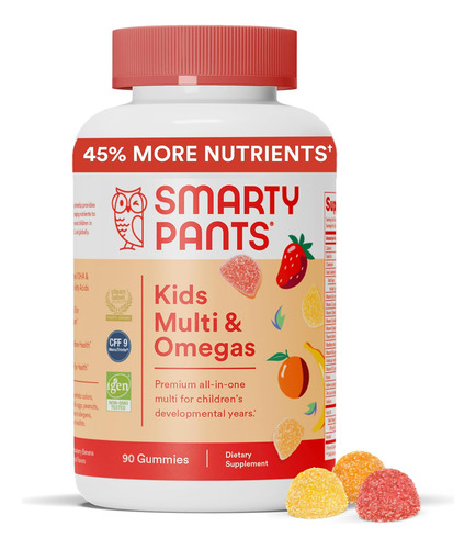 SmartyPants Kids Complete é um multivitamínico multifuncional que torna a criação de uma família saudável um pouco mais fácil e muito mais deliciosa. Cada porção fornece uma mistura robusta de vitaminas e nutrientes premium, incluindo ácidos graxos essenciais ômega-3 EPA e DHA, vitamina D como D3 para a saúde óssea, vitamina B12 para a saúde imunológica, folato como metilfolato, iodo para suporte da tireóide e vitamina E antioxidante, todos em uma deliciosa goma.*Nosso Kids Complete não é OGM e inclui ingredientes cuidadosamente selecionados para preencher as lacunas de nutrientes típicas da dieta ocidental média. Assim, seu filho obtém mais nutrientes que você deseja, sem nenhuma das coisas nojentas. Incluímos ingredientes em formato premium, sem adição de corantes sintéticos, sabores artificiais ou adoçantes.
