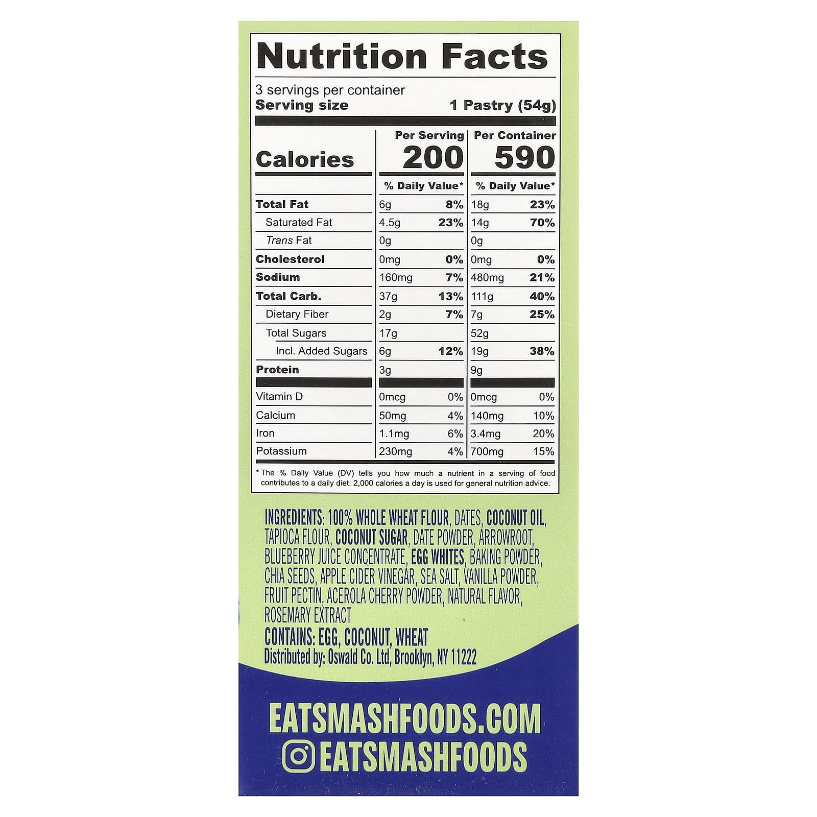 100% farinha de trigo integral, tâmaras, óleo de coco, farinha de tapioca, açúcar de coco, tâmara em pó, araruta, suco concentrado de mirtilo, claras de ovos, fermento em pó, sementes de chia, vinagre de sidra de maçã, sal marinho, baunilha em pó, pectina de frutas, acerola em pó, sabor natural, extrato de alecrim.
