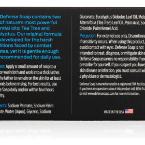 Defense Soap provides full strength natural essential oils PROVIDES A BROAD SPECTRUM OF BENEFITS DERIVED FROM TEA TREE OIL AND EUCALYPTUS OILS CLINICALLY PROVEN NATURAL INGREDIENT effective at thoroughly washing PROVEN IN THE WORLD OF CONTACT SPORTS EFFICIENTLY REMOVES dirt, grime, gym crud, sweat, smog, allergens, grunge, and built up oils HIGHEST QUALITY. Triple milled for quality, consistency and longevity HIGH DENSITY LATHER for deep cleansing pores SUPERIOR RINSING action RESTORES THE SKINS natural barrier and helps controls the production of sebum and dead skin cells PERFECT FOR ACTIVE LIFESTYLES supports proper hygiene routines. Recommended after workouts. NATURAL DEODORIZING INGREDIENTS helps wash away odor HYPOALLERGENIC eucalyptus scent SAFE for sensitive skin NATURAL, FREE & CLEAR. NO FRAGRANCES, DYES, COSMETICS, PETROCHEMICAL COMPOUNDS, ALCOHOL OR SODIUM LAURYL SULFATE. MADE in the USA – CLINICALLY PROVEN NATURAL TEA TREE OIL AND EUCALYPTUS OIL provide a broad spectrum of benefits effective at promoting healthy skin – PROVEN IN THE WORLD OF CONTACT SPORTS TO EFFICIENTLY REMOVE dirt, grime, gym crud, sweat, smog, allergens, grunge, and built up oils – HIGHEST QUALITY WASH WITH SUPERIOR RINSING ACTION restores the skins natural barrier and helps controls the production of sebum and dead skin cells – HYPOALLERGENIC AND SAFE eucalyptus scent for sensitive skin. Triple milled for quality, consistency and longevity – NATURAL, FREE & CLEAR with no fragrances, dyes, cosmetics, petrochemical compounds, alcohol or sodium lauryl sulfate. A natural soap for men, women, and children.